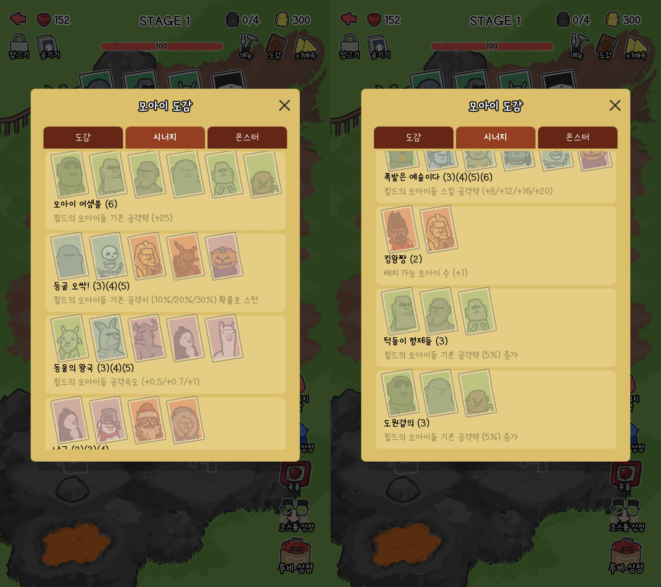 모아이 도감에는 도감과 시너지가 있습니다. 시너지는 모아이 조합에 따른 보너스 효과로, 저는 모아이 어셈블, 턱돌이 형제들, 도원결의, 킹왕짱 이 조합을 애용합니다. 그리고 적용중인 시너지는 오른쪽 하단에 이름이 표시되므로 도감을 열어서 확인하지 않아도 됩니다.