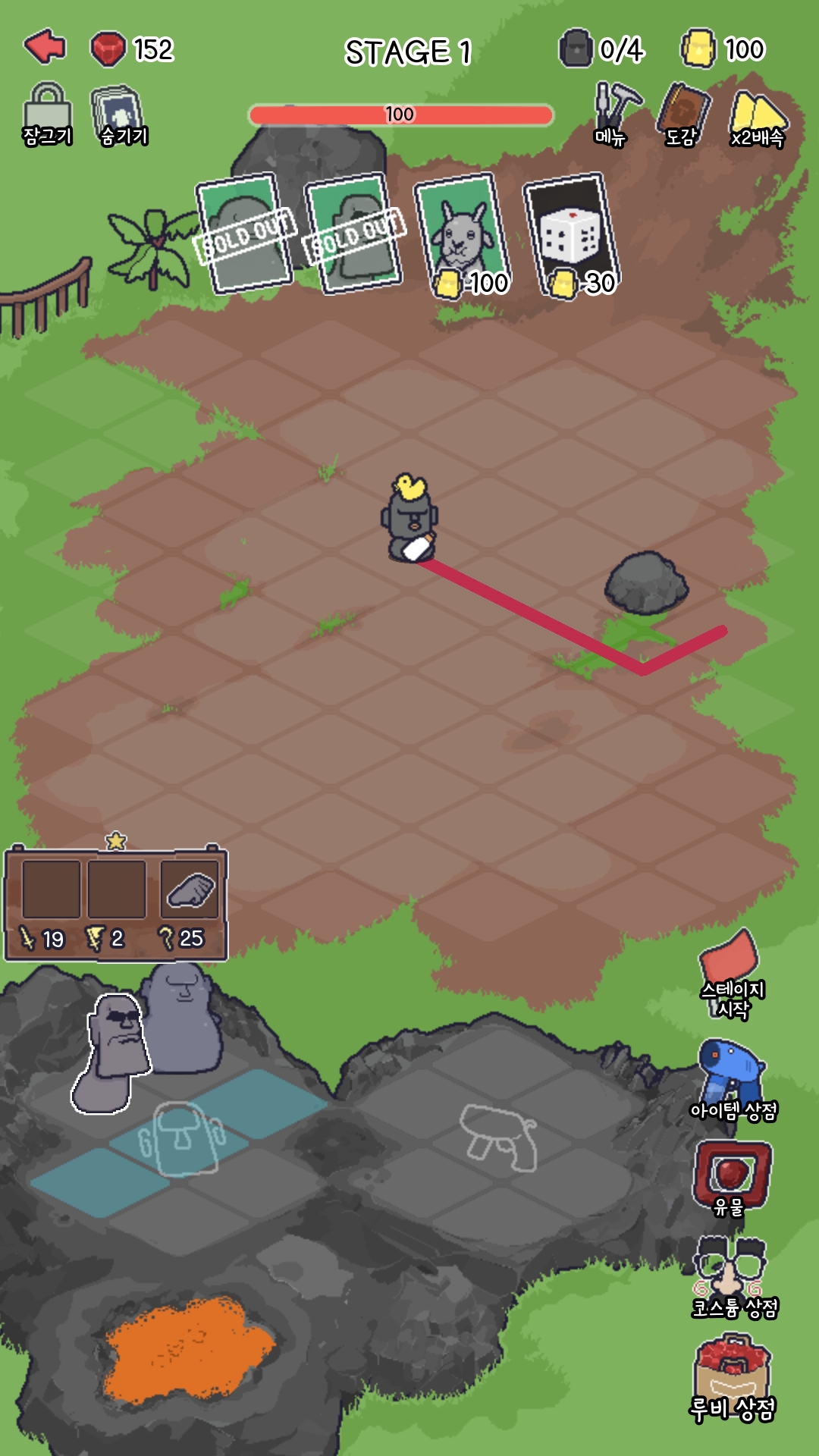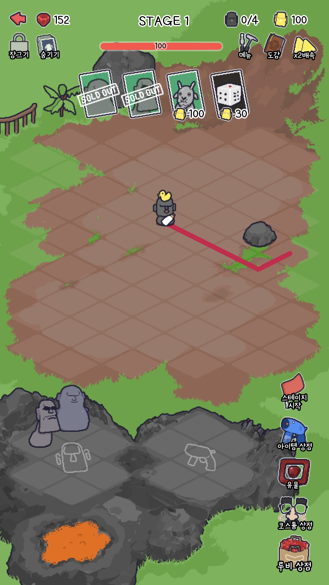 첫 번째 챕터 시작 화면입니다. 게임은 가운데 있는 아기 모아이를 지키는 게 주 목적이며, 게임 상단에 100이라고 쓰여져 있는게 아기 모아이의 체력입니다. 그리고 스테이지 시작을 누르면 몬스터는 빨간 라인을 따라서 걸어오게 되는데 오른쪽 위에있는 재화(300)로 모아이를 사서 배치를 해주면 됩니다. 만약 잘못 구매했다면 왼쪽 아래 용암으로 드래그 앤 드랍하여 판매하시면 됩니다.