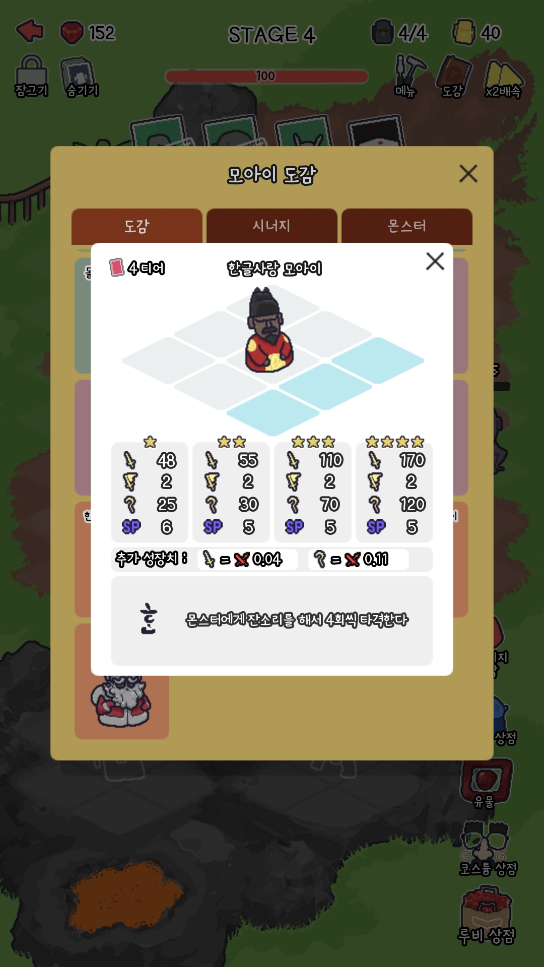 여기서 파란색 테두리의 모아이가 보이시나요? 위에서 말했듯 3성 모아이 입니다. 3성 모아이 2마리를 합치면 4성 모아이가 되는데, 4성을 만들려면 1성 모아이가 총 8마리가 있어야 하는거죠.