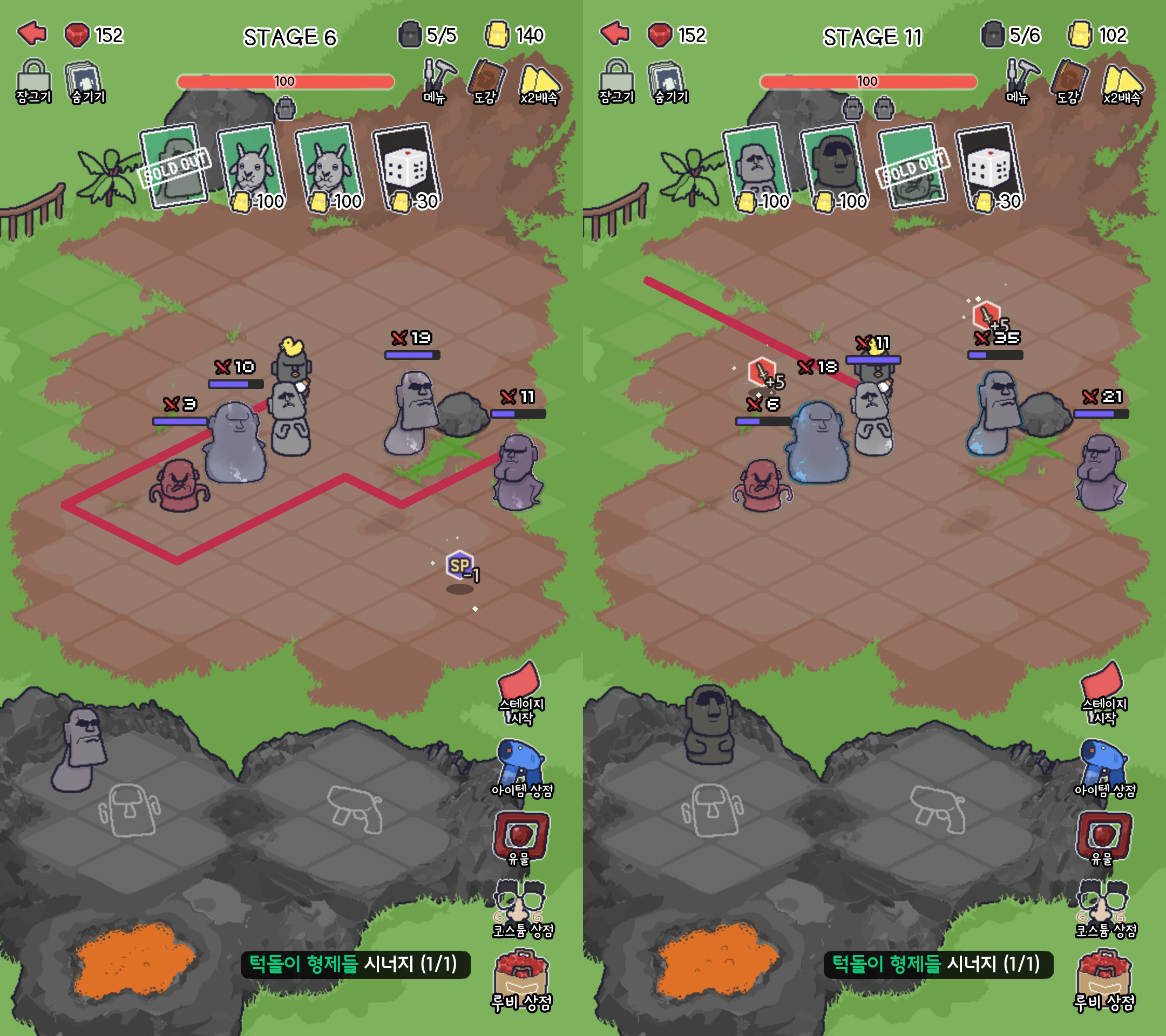 그리고 10스테이지 단위로 몬스터가 나오는 위치가 변경됩니다. 따라서 또 그에 맞게 모아이와 돌을 사용해서 길을 만들어주세요.