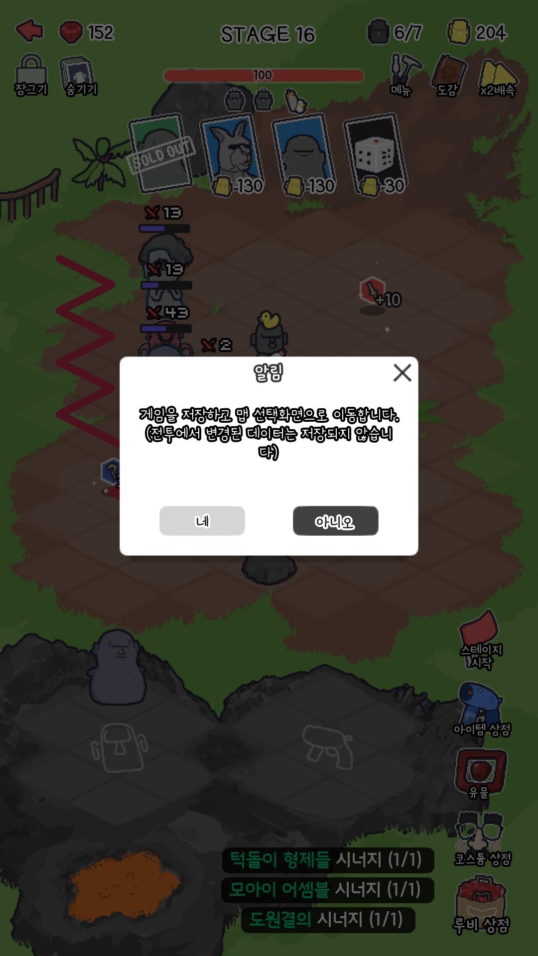 초반에는 모아이를 사느라 여유가 없지만, 후반가면 아이템도 구매하여 모아이에 장착시킬 수 있습니다. 같은 아이템 2개는 불가능한데, 개인적으로 웬만한 애들은 고무장갑 + 너클이 좋습니다.