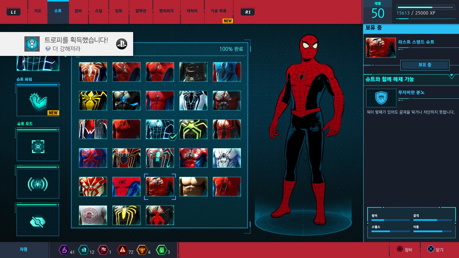 게임의 장점이라면 수트를 이것저것 바꿔 낄 수 있다는 점인데, 그냥 주어지는 건 아니고 서브 미션을 완료하거나 미션을 진행하면서 획득한 토큰을 사용해 제작 또는 스토리상 자동으로 해금됩니다. 각 슈트를 얻을 때마다 슈트와 함께 해제되는 '슈트 파워'라는 게 있는데 슈트의 자체 능력 때문에 입기 싫은 슈트를 입는 게 아니라 슈트에 능력을 장착하여 입고 싶은 슈트를 입으면서 사용하고 싶은 능력을 쓸 수 있다는 건 아주 큰 매력이자 장점입니다.