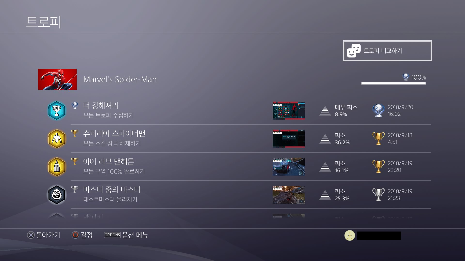마블스 스파이더맨은 2018년 9월 7일에 발매한 게임으로, 저는 당시 PSN을 통해서 발매 전 예약 구매를 해놓았던 게임이었는데요. '일반판'과 '디지털 디럭스 에디션' 그리고 피규어 등 여러 가지를 포함한 '콜렉터스 에디션' 세 가지를 판매했었는데 일반판을 제외하고는 당시 나오지 않았던 '추가 DLC 3종'이 포함되어 있었고, 사람들 사이에서 발매 전부터 대작이라는 이야기가 돌아다녀서 저는 피규어는 필요 없었기에디지털 디럭스 에디션을 구매했었습니다. 9월 7일에 발매한 게임인데 플래티넘 트로피를 9월 20일 날 획득했으니 2주 동안 엄청 달렸나 봅니다.