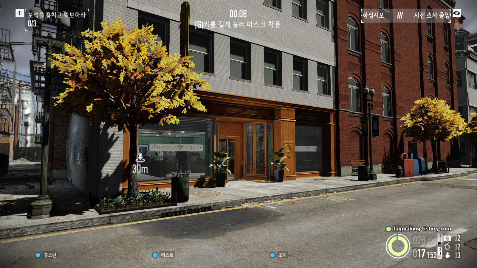 게임을 시작하면 우선 주변을 둘러볼 수 있습니다. 하지만 경비나 경찰에게 발각될 경우 스텔스모드가 풀리기 때문에 주의해야 하며, 'G'키를 길게 누를 경우 마스크를 착용하는데, 마스크 쓴 것을 일반 시민들이 보게 되면 마찬가지로 스텔스 모드가 풀립니다. 스텔스가 가능할 경우 게임 시작 전 알려주고, 성공할 경우 스텔스 보너스를 받습니다.