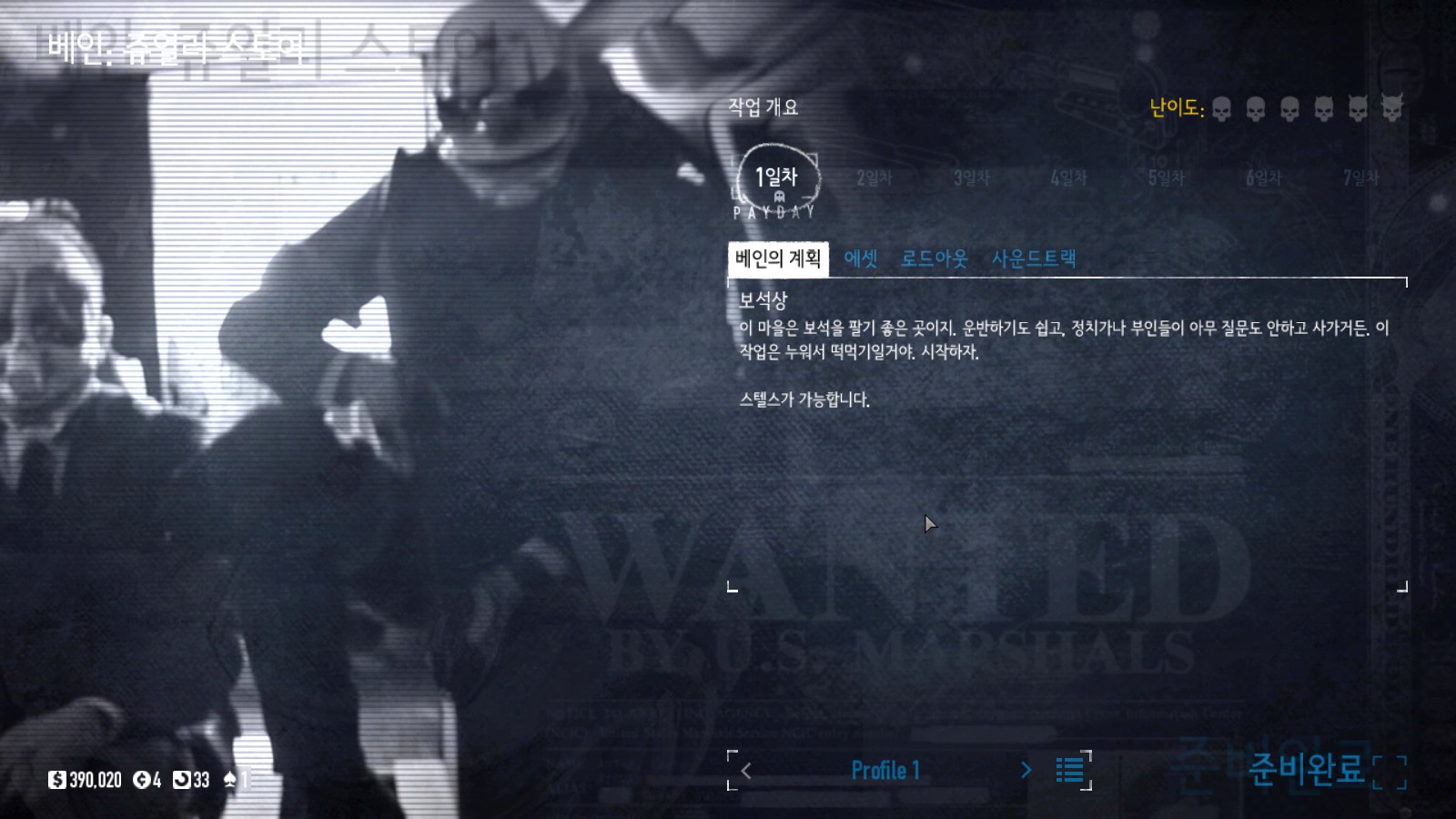 한글 패치를 하면 이처럼 한글로 잘 나옵니다. 일단 저는 시작 전에 간단하게 '은행을 터는 게임'으로 알고있었는데 반은 맞고 반은 다릅니다. 결국에는 뭔가를 훔친다는 부분에서 맞는 말이지만, 훔치는 건 돈에 한정되지 않고, 연구자료, 귀금속 등 여러 가지를 훔칩니다.