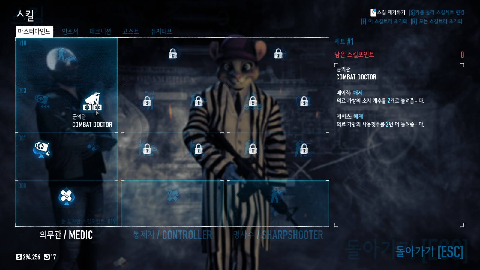 페이데이2는 멀티플레이를 지원하며, '최대 4인'까지 가능합니다. 때문에 팀원끼리 스킬 트리나 아이템 조합을 잘 짜서 가는 게 중요합니다. 저 같은 경우 군의관을 담당했는데, 하고 싶어서 한건 아니고 잘못 눌러서 스킬을 찍었습니다. 역할을 나누고 알아챈 거지만 오른쪽 위에 보이는 것처럼 스킬 트리는 '부분 초기화'와 '모두 초기화'가 가능합니다.