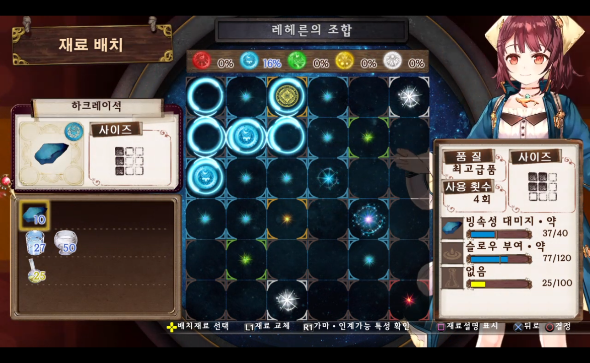 오른쪽 아래 연금술 레벨이 보이실텐데, 연금술을 하면 할수록 경험치가 쌓이고, 그에 따라 연금술이 발전하는 방식입니다. 재료는 또 품질, 사이즈, 효과, 특성 등 각각 고유의 성질을 가지고 있으며 만드는 아이템에 따라 그것들을 고려하여 재료로 선택을 하여야 합니다. 공격아이템으로 예를들자면 같은 아이템이라도 방법에 따라 범위와 데미지가 달라지는 등 조합에따라 결과물이 달라집니다.