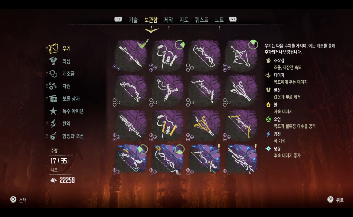 무기도 종류가 다양한데요. 같은 활이라도 능력치가 다르므로 능력치가 좋은 활을 얻는게 중요합니다. 하지만 얻는 방식이 사냥을 통한 파밍이 아니라 상점에서 구입하거나 정해진 루트를 통해서 얻는 방식이기 때문에 무기를 얻기 위해 노가다는 필요 없지만, 그만큼 플레이타임도 줄게 됩니다. 그리고 같은 활이라도 종류가 다양한데요. 결과적으로 퀵슬롯에는 4개만 장착할 수 있기 때문에 선호하는 타입에 따라 장착해주시면 되고, 저의 경우 줌은 느리지만 스나이핑에 특화된 샤프 샷 활을 주로 사용합니다.
