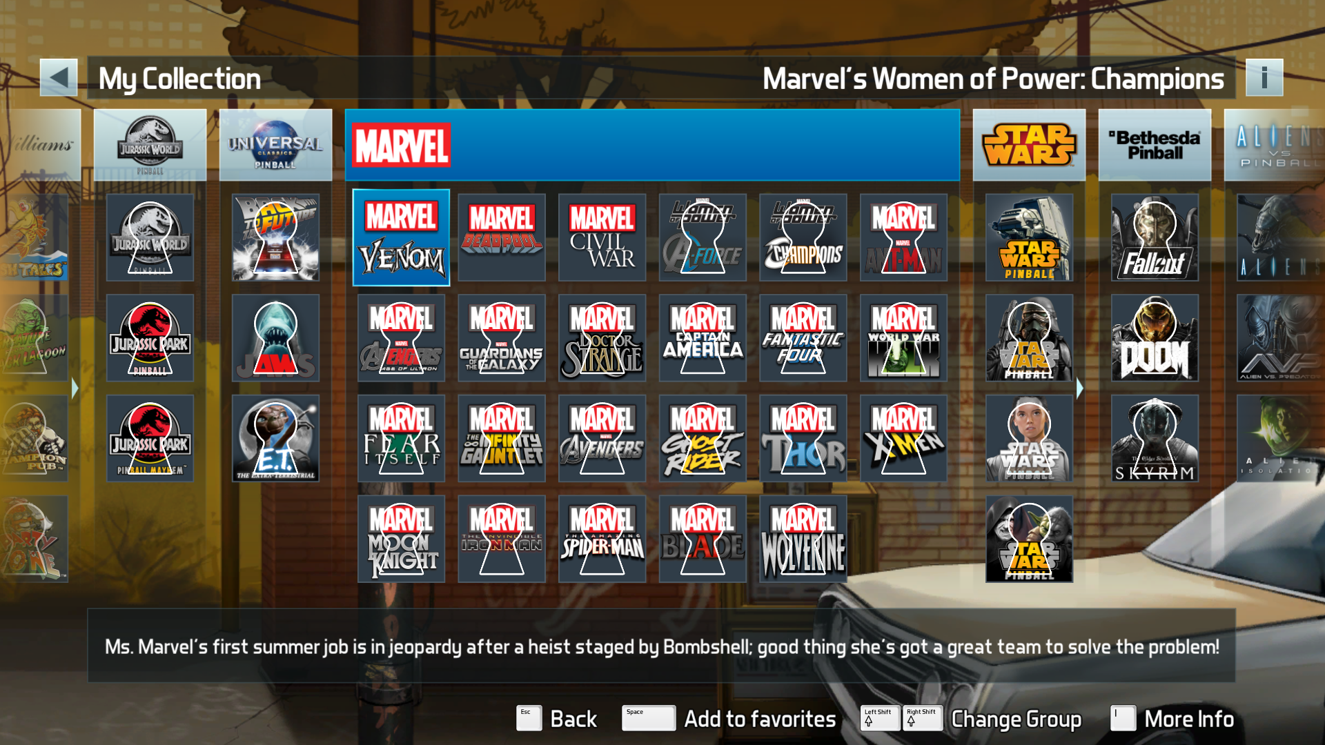 DLC를 구매해서 그런지 마블과 스타워즈 그리고 에일리언 컬렉션이 열려있습니다. 위에 보이는 네모마다 핀볼의 장치가 달라지게 되는데요. 사실 마블 영화 시리즈를 다 재밌게 봐서 상당히 기대했었는데 결과적으로 스타워즈가 훨씬 재밌었습니다. 마블에서 열려있는 3개를 다 해봤는데 뭔가 시시해요. 그나마 데드풀이 좀 괜찮은 것 같기도 하면서 너무 단순합니다. 그래서 다른 핀볼도 이런 줄 알았는데 스타워즈는 영화를 안 봐서 팬도 아닌데 재밌다고 느꼈습니다.