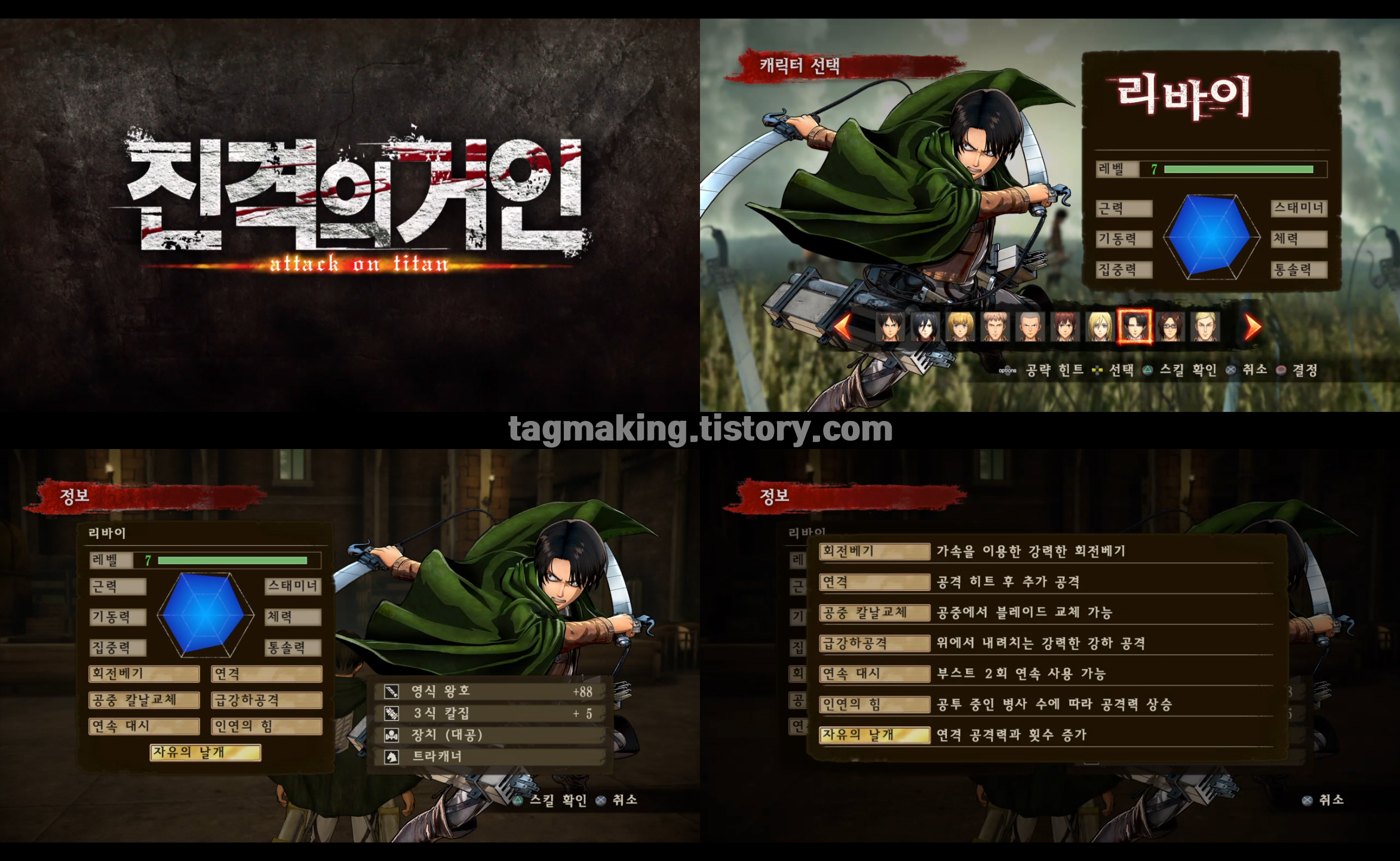 게임은 엘렌 예거, 미카사 아커만, 아르민 알레르토, 크리스타 렌즈, 사샤 브라우스, 코니 스프링거, 쟝 키르슈타인, 리바이, 한지 조에, 엘빈 스미스 이렇게 총 10명의 캐릭터를 조작할 수 있으며, 각 캐릭터는 레벨이 증가함에 따라 스킬이 개방됩니다. 그 중 최강의 캐릭터는 '리바이'인데요. 딜이 가장 높아서 사람들이 많이 선호하는 캐릭터 입니다. 7레벨을 찍으면 열리는 스킬 '자유의 날개'는 추가공격이 최대 5연타까지 가능합니다. 다만, 리바이의 경우 워낙 정신없게 움직이다 보니 다른캐릭터에 비해 프레임 드랍이 발생합니다. 그리고 일반 캐릭터는 스킬을 사용하면 부가 효과를 얻는데 그치지만, 엘렌 예거의 경우 '스토리 3장 7화를 클리어' 하면 스킬 사용 시 만화처럼 거인으로 변신이 가능합니다.