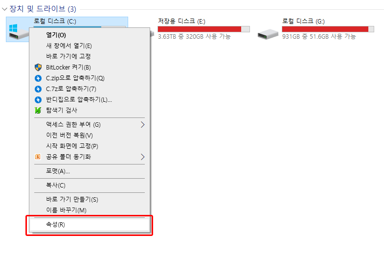 우선 내 컴퓨터 - 윈도우가 설치된 디스크(보통 C드라이브)를 마우스 우클릭 - 속성 클릭
