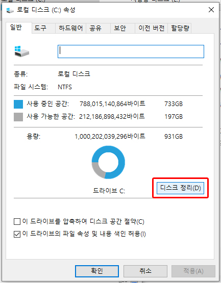 그럼 이와 같은 창이 뜨는데 다른 탭으로 이동하지 마시고, 디스크 정리를 눌러주세요.