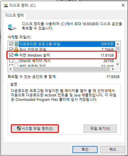 그럼 이러한 창이 뜨는데 여기서 '이전 Windows 설치' 이 부분이 windows.old 폴더를 뜻합니다. 이 부분을 체크 후 시스템 파일 정리를 눌러 줍니다. 오래 걸리지 않고 금방 삭제됩니다.