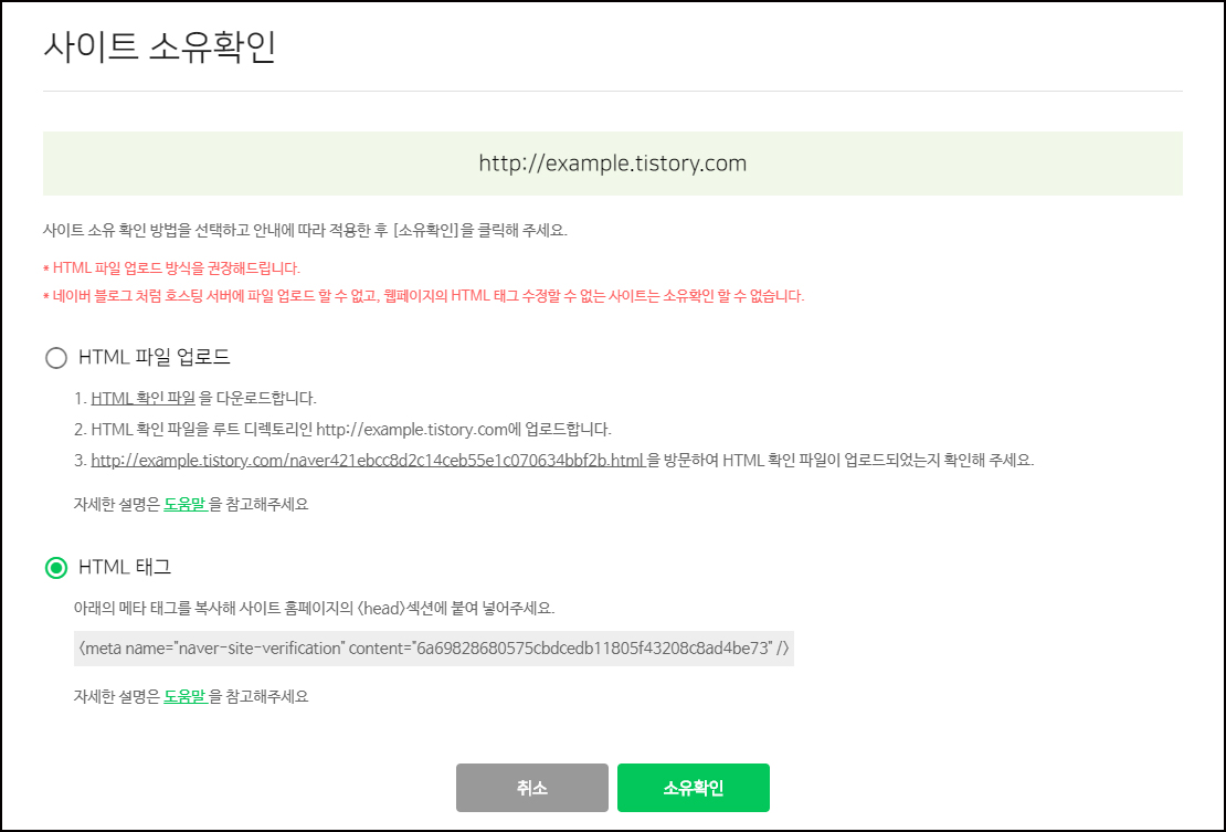 그럼 이런 창이 뜰거에요. 위에 주소는 자신의 블로그 주소면 됩니다. 여기서 HTML 파일 업로드 말고 HTML 태그를 선택하세요. 그리고 아래 메타 태그를 복사 합니다.