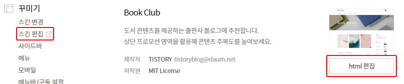 이제 블로그 관리에 들어가셔서 스킨 편집 - html 편집을 눌러주세요.