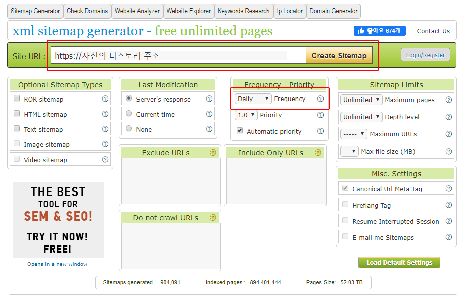 그럼 이런 화면이 나올 텐데, Frequency - Priority에서 프리퀀시를 Daily로 설정해주세요. 그리고 주소창을 보시면 기본 입력이 http://인데 https://로 꼭 바꾸고 만드셔야 합니다. 다 되셨으면 Create Sitemap을 누르고 기다려 줍시다. 포스팅의 양이 적을수록 빨리 완료됩니다.