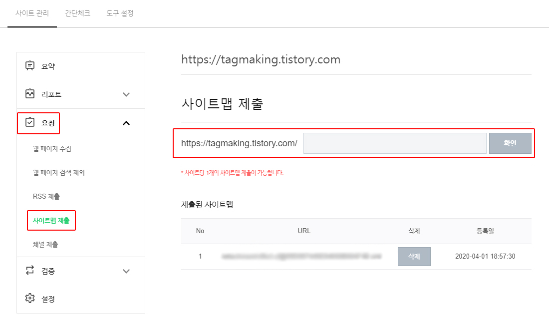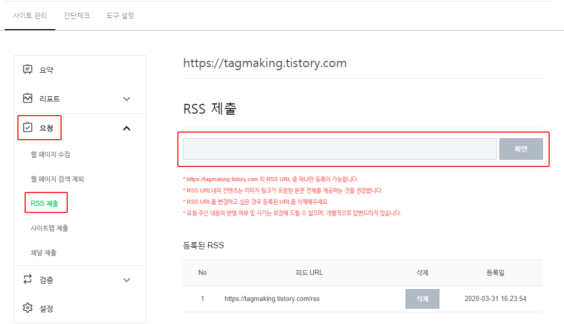 그리고 네이버 웹마스터 도구에 돌아가셔서 요청 - RSS 제출 클릭 후 자신의 티스토리 주소/rss로 등록을 해주세요.