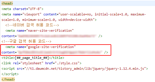 네이버 때와 마찬가지로 <head>와 </head> 사이에 붙여 넣어 주세요. 그리고 적용 후, 구글 서치 콘솔에서 확인을 눌러주시면 됩니다.