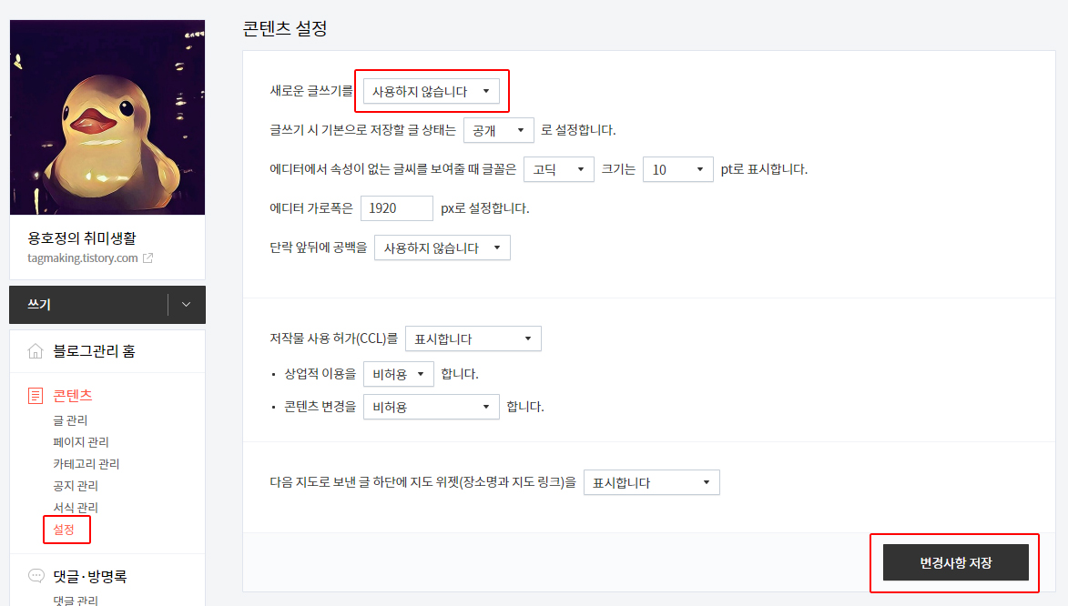 xml 파일을 이제 블로그에 올려야 하는데, 그전에 약간의 수정이 필요합니다. 사이트 맵의 주소를 복사하기 위해선 구 버전의 에디터를 사용해야 하기 때문인데요. 위와 같이 설정 후 변경사항 저장을 해주세요.