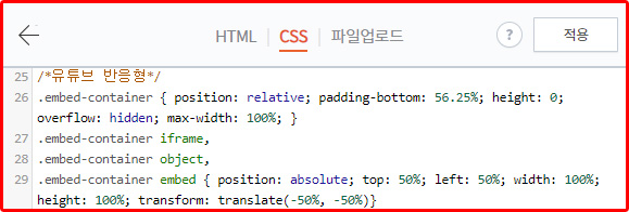 위 사이트에서 동영상 주소를 붙여 넣기 하여 embed 버튼을 누르면 반응형 태그로 변환되어 나옵니다. 하지만, 티스토리 블로그에 올리려고 하시는 분들에게는 추천드리지 않는 방법이에요.