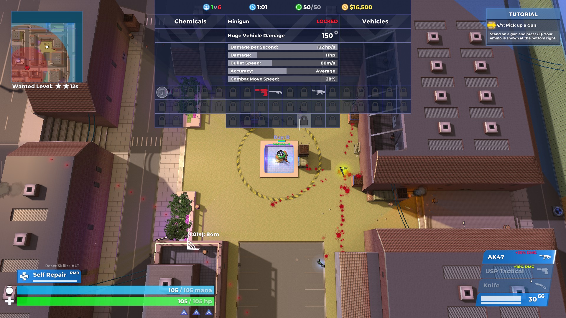 게임 내부에는 상점도 있는데요. 미니건 몇 개를 제외하고는 아직 잠금 된 부분이 많네요. 탈것은 저기서 사지 않아도, 주변에 많이 있으니 훔쳐서 타면 됩니다.