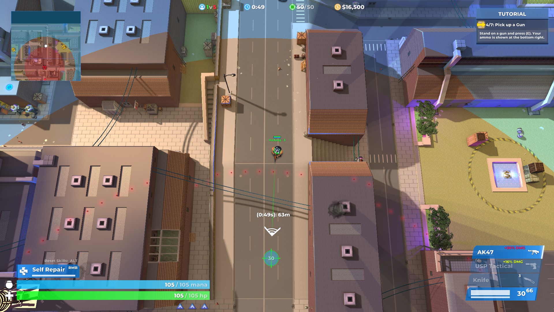 그리고 보이는 것처럼 자기장 요소가 있긴 한데요. 맵이 엄청 작아서 자기장이 한 번만 작아져도 한 화면에 다 들어올 정도입니다.