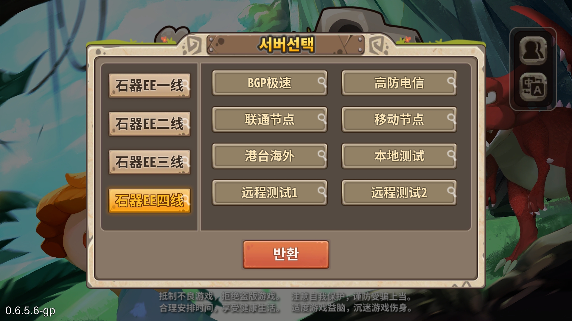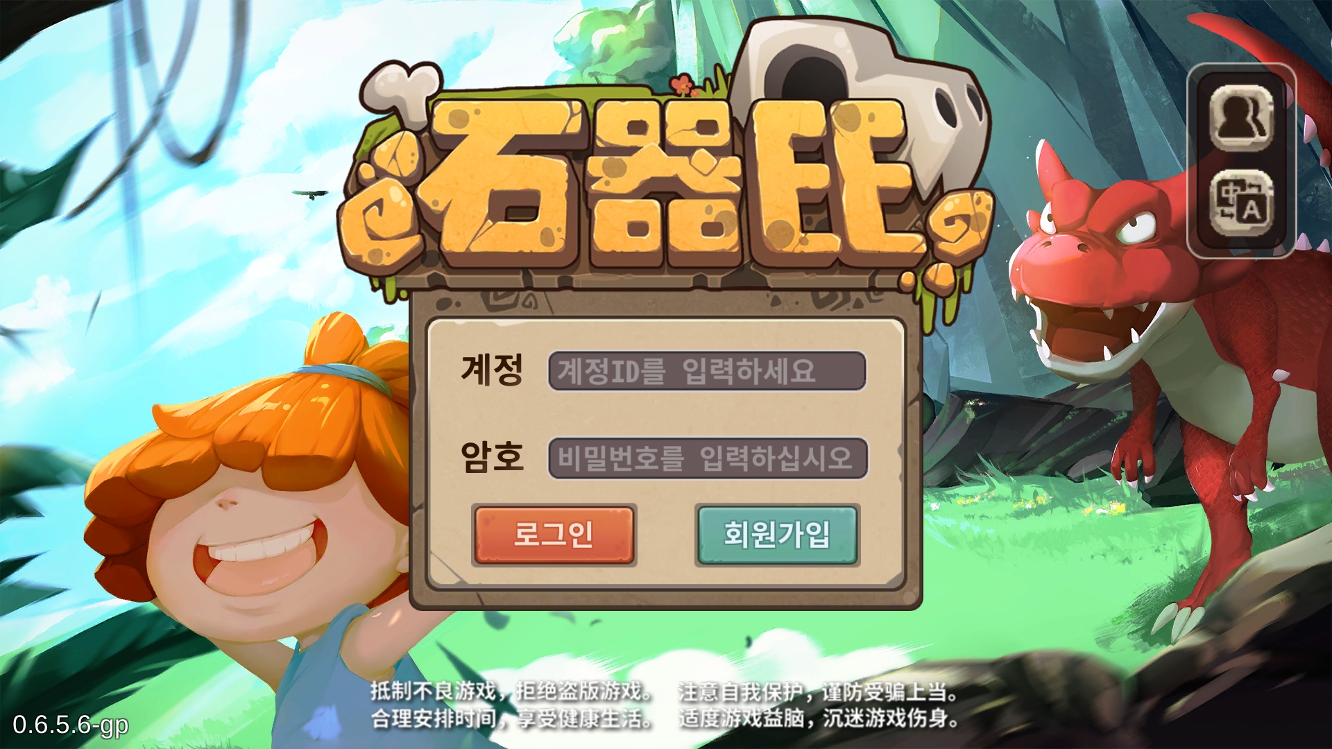 그럼 이런 로그인 창이 나오는데, 한문으로 쓰여있기는 '석기EE'라고 쓰여있네요. 우선 무슨 말인지 알 수 없으니 오른쪽 위에 언어를 눌러 한글을 선택해줍니다. 한글을 선택하셨으면 재부팅을 한 번 해주세요. 그런데 한글이라고 해도 그냥 번역기를 돌린 수준이라 게임을 처음 접하신 분들은 아얘 진행이 불가능할 수도 있습니다. 정확히 말씀드리면, 오토가 섞여서 진행이 가능하긴 한데 추억 보정이 없으면 재미가 없을 거예요.