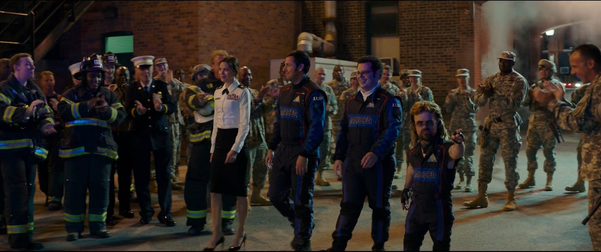 픽셀과 전쟁에서 승리한 후 이제 겨우 두 번 이겨서 외계인과 전적 2대 2인 상황. 외계인이 침공 시간을 마음대로 정하기 때문에 다음 전투를 대비해도 모자랄 판에 마치 완전 승리한 것처럼 파티 장면이 나옵니다.