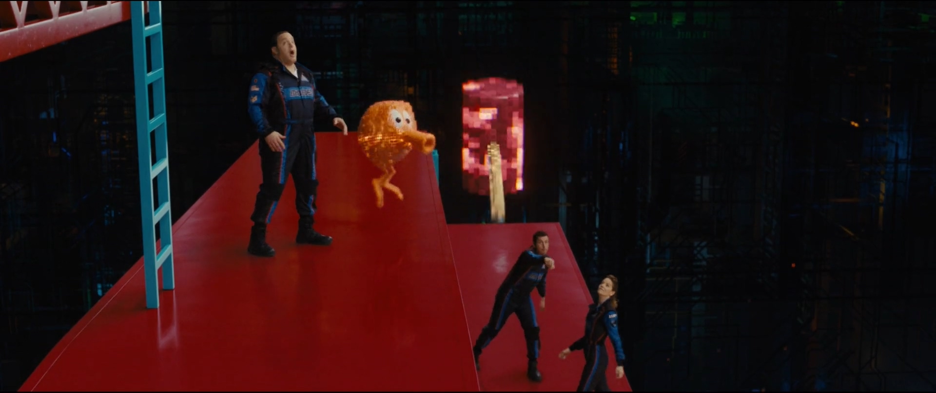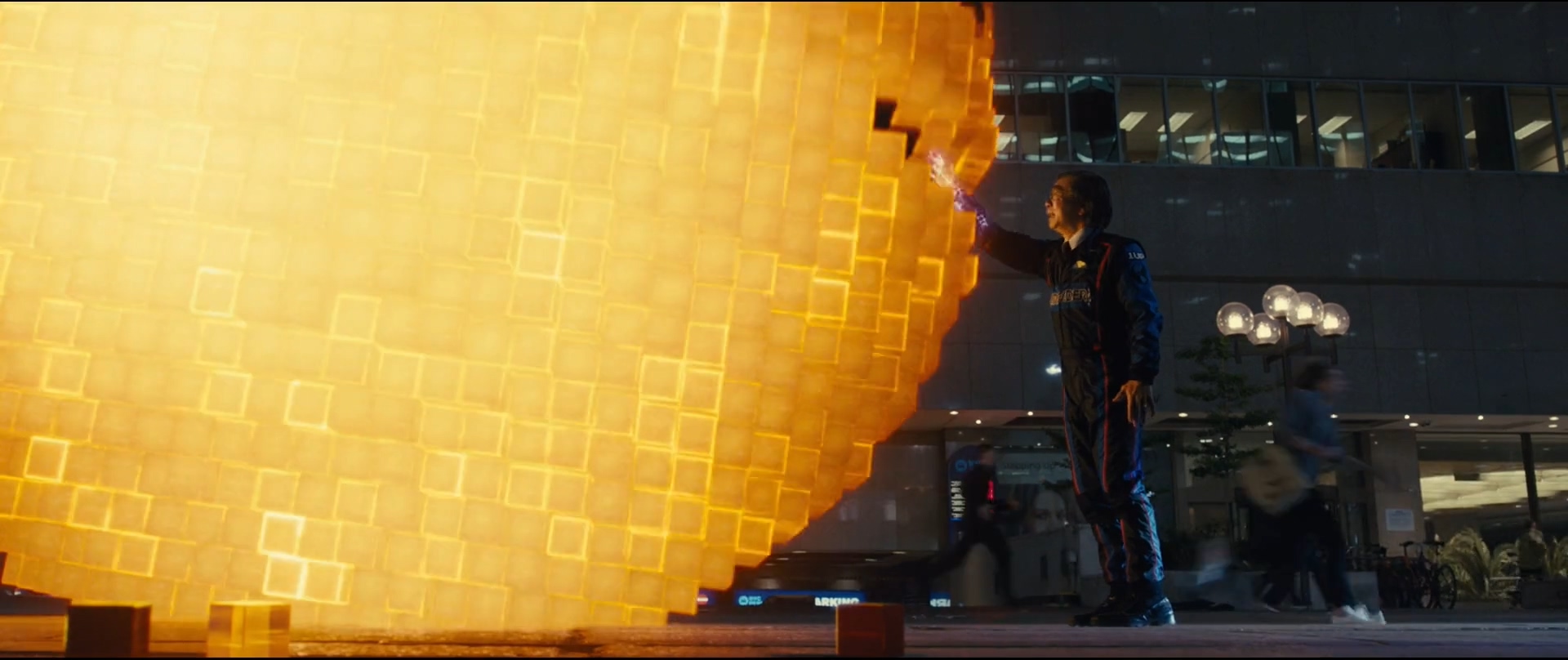 또 픽셀과 싸울 때 픽셀의 아버지 이와타니 교수(데니스 아키야마)는 픽셀은 원래 착한 아이라며 차에서 내려 다가가지만 픽셀은 교수를 공격하는데요.