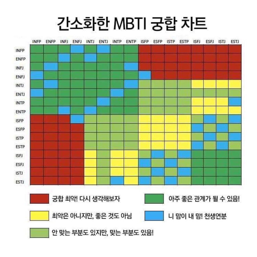 지난주 '놀면 뭐하니?'에서 이효리, 비, 유재석 씨가 MBTI 검사를 하는 모습이 나왔는데, 검사를 마치고 멤버 간 궁합을 확인했었습니다. 그게 이 표를 보고 확인했나 보네요. 근데 이것도 마찬가지로 재미로 보는 궁합이니, 친구와 궁합이 안 좋다고 신경 쓰실 필요는 없습니다. 어쨌든 요즘 유행이라니 또 한 번쯤은 해보는 것도 나쁘지 않은 것 같아요.