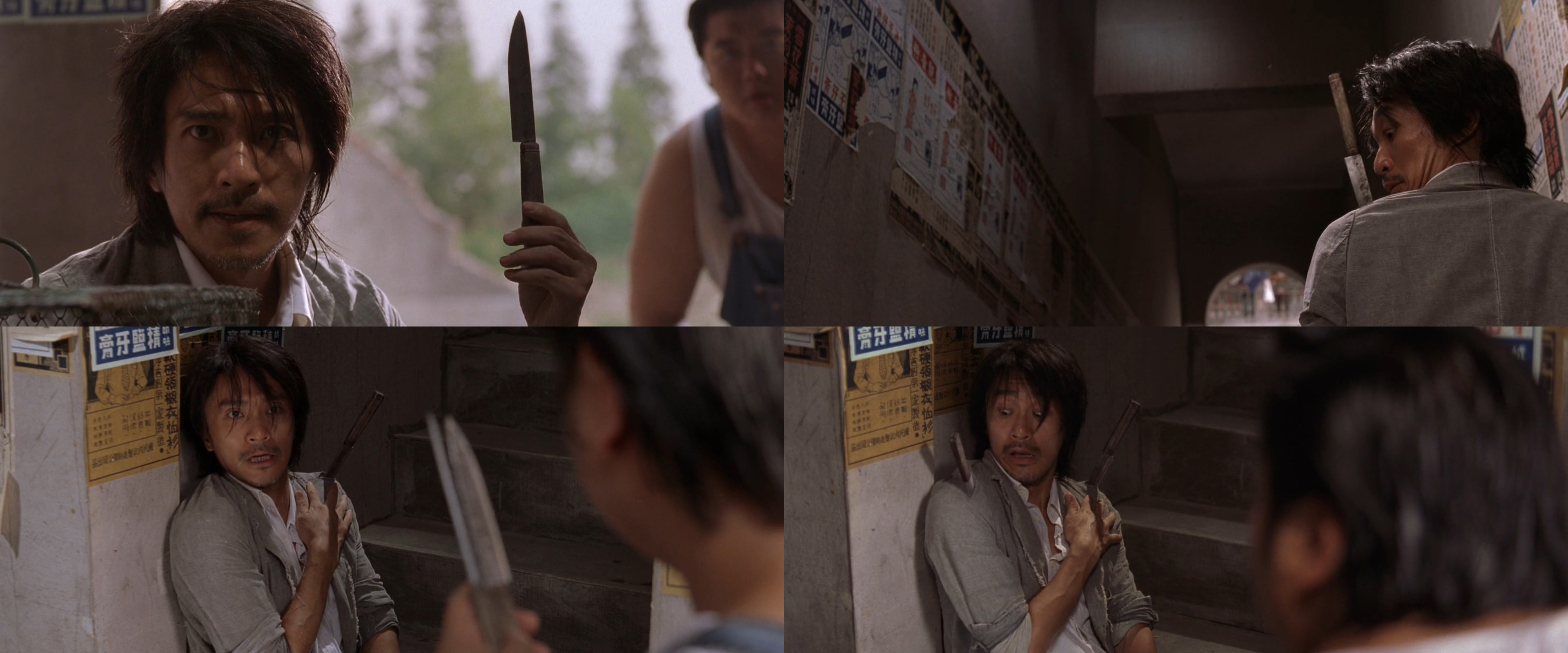 싱은 돼지촌에 복수를 하고 도끼파에 인정받으려 하지만 어이없게도 자신이 던진 칼이 벽에 맞고 튕겨 자신의 왼쪽 어깨에 꽂히게 됩니다. 때문에 오른팔에게 대신 맡기는데 오른팔이 던진 칼은 싱의 반대쪽 어깨에 꽂힙니다. 이렇게 결국 복수에 실패하고 도망치는 두 사람.