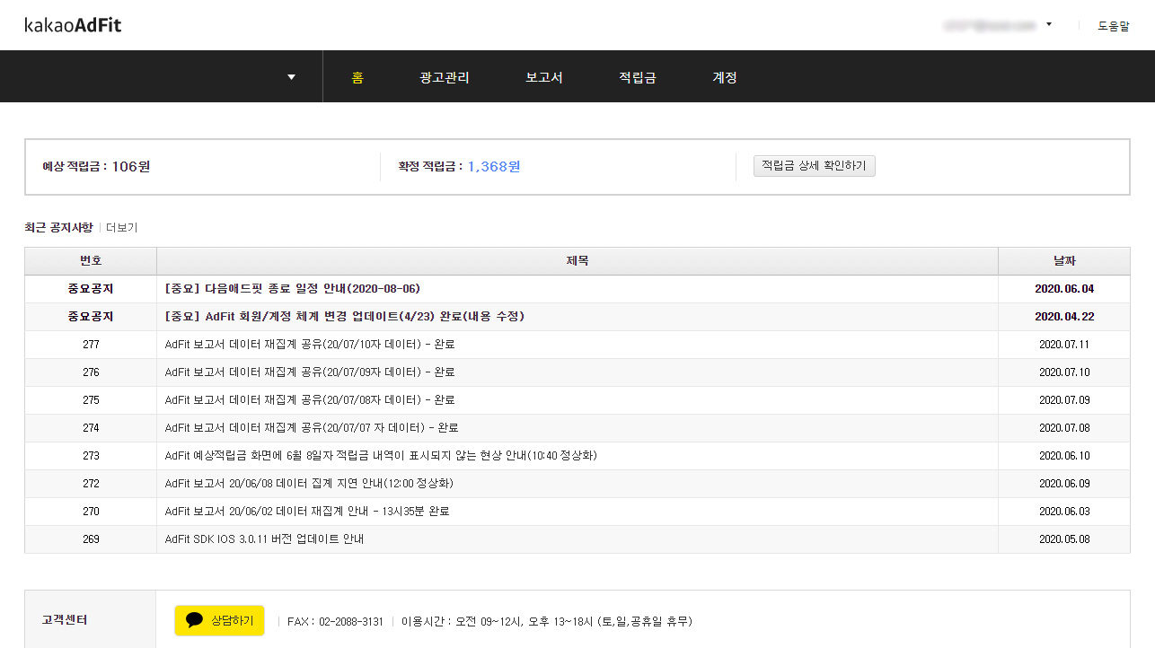 수익은 3개월 하면서 1,368원입니다. 애드핏은 오로지 블로그 방문수로 수익이 결정되는 것 같아요. 위에서 말했던 128원의 수익을 낸 날도 클릭 수는 없고, 오히려 클릭 수가 있는 날이 6원인 경우도 있어서 애드센스랑 다르게 광고 클릭 수가 그렇게 의미는 없는 것 같습니다. 또 애드핏의 경우 5만 원 이상일 경우 지급 신청이 가능하며, 5년간 지급 요청이 없는 경우 적립금이 소멸될 수 있다고 하니 1년에 만원은 벌어야 한다는 얘긴데 제 경우 1년 해도 만 원은커녕 5천 원도 힘들겠어요.