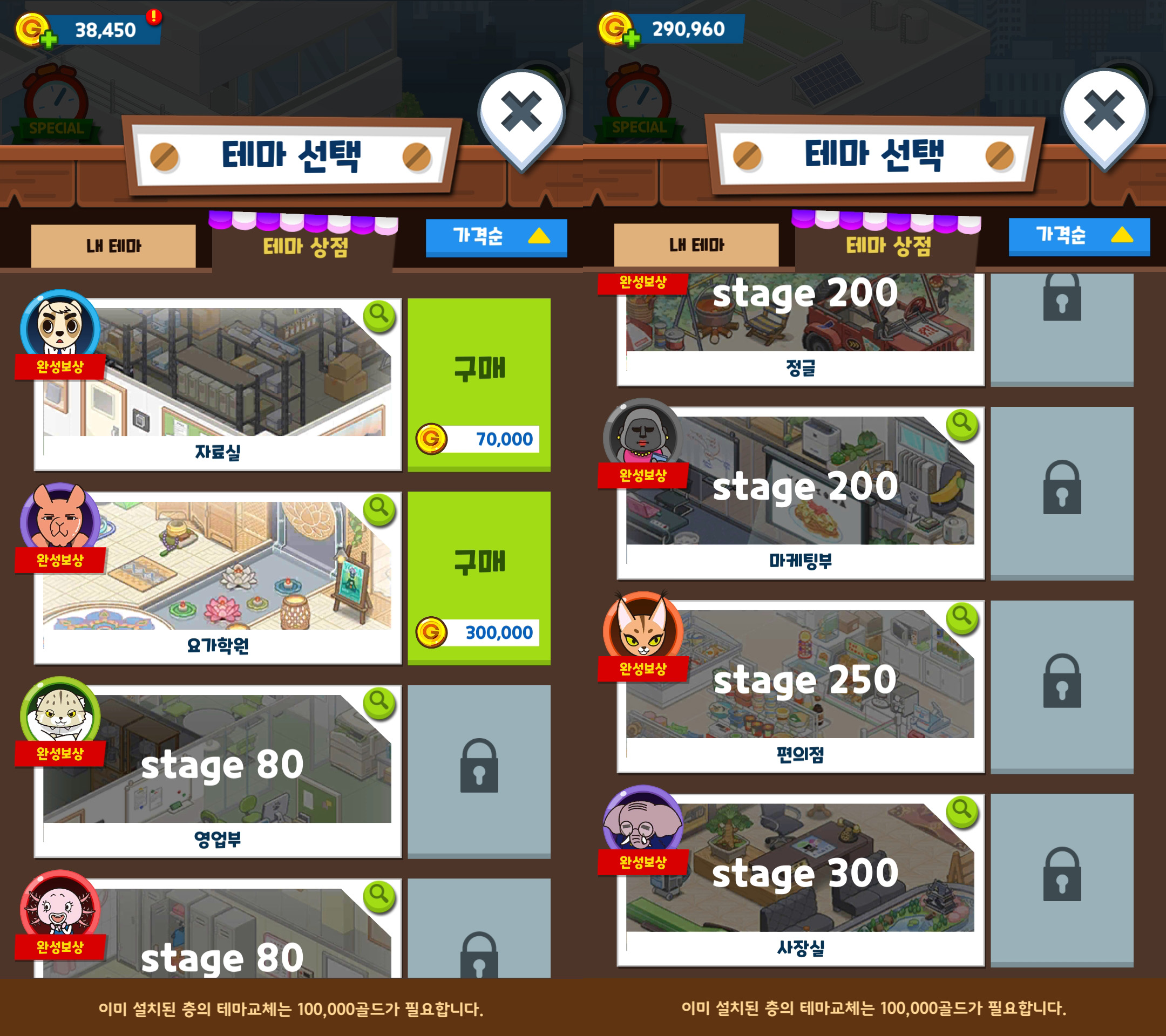 리모델링은 각 층마다 자신이 원하는 테마를 지정할 수 있으며, 처음엔 '카페테리아'와 '경리부 오피스' 테마를 기본 지급하고 이후 테마는 스테이지를 클리어하여 잠금을 해제한 뒤 골드로 구매할 수 있습니다. 또 테마를 완성할 때 캐릭터를 지급해주는데, 저는 현재 '요가 학원'을 구매했습니다.