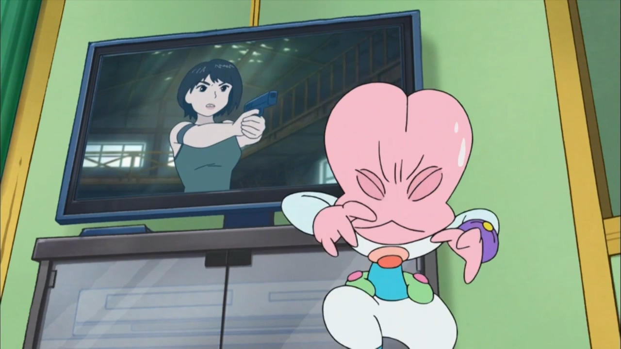 그러던 중 짱구가 드라마 할 시간이라며 TV를 켜게 되는데 하필 총을 쏘는 장면이 나오게 되고