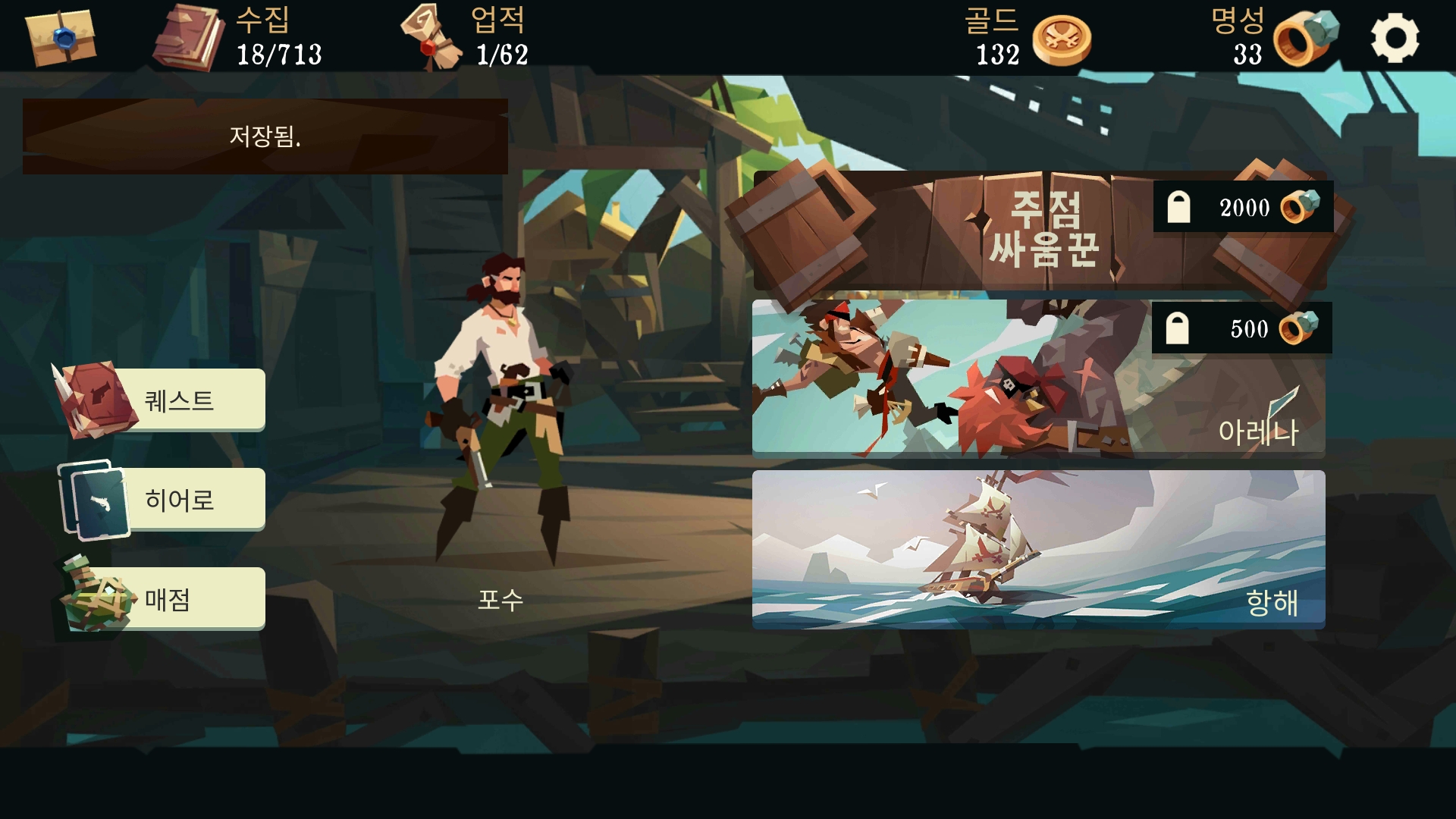 게임을 클리어하면 명성도 얻을 수 있는데 명성으로 항해 스테이지나 다른 콘텐츠인 아레나와 주점 싸움꾼을 열 수 있네요.