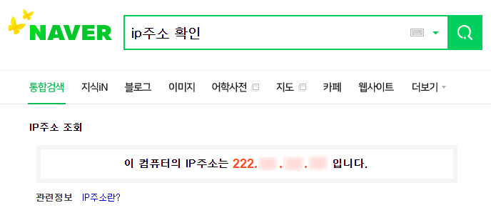 하지만 네이버에서 ip를 검색할 경우 방금 확인한 내 컴퓨터의 ip와는 다른 ip가 나오게 되는데, 이 ip는 바로 위에서 말했던 공유기가 할당받은 공인 ip입니다.