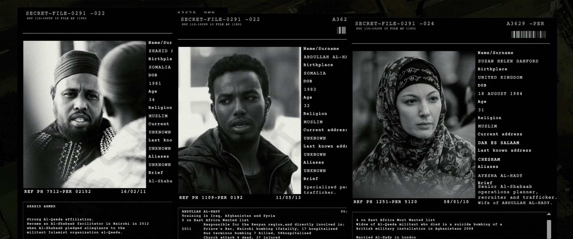 이들이 작전을 통해 잡아야 하는 테러범은 알샤바브의 조력자 샤히드 아흐메드, 그리고 압둘라 알 하디와 그의 아내 아이샤 알 하디. 여기에 조직의 신참 두 명까지 포함하여 잡아야 하는 테러범은 모두 다섯입니다.
