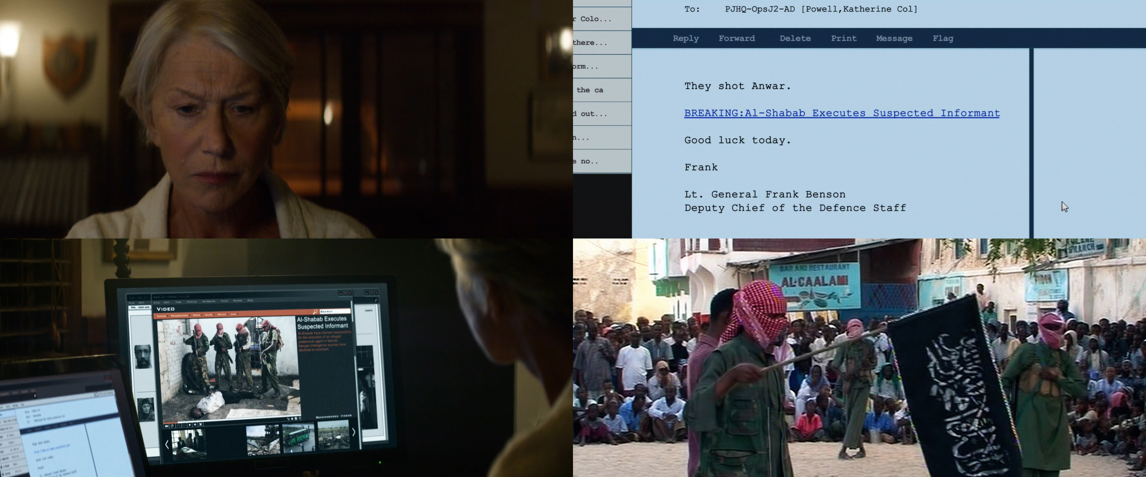 한편 이른 아침 영국군 대령 캐서린 파월(헬렌 미렌)에게 한 통의 메일이 도착합니다. 메일의 내용은 케냐 내 극단주의 테러조직인 '알샤바브'가 영국과 케냐 정보국 소속의 스파이를 죽였다는 이야기가 담겨 있는데요.