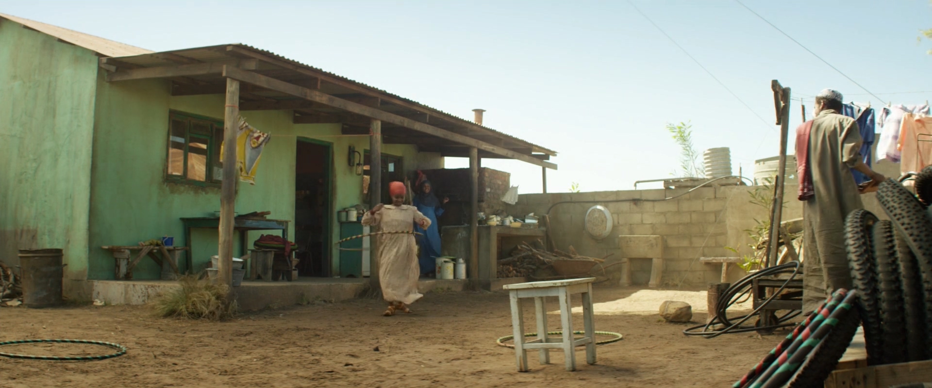 케냐의 어느 마을의 가정집. 한 소녀가 집에서 훌라후프를 하며 놀고 있습니다.