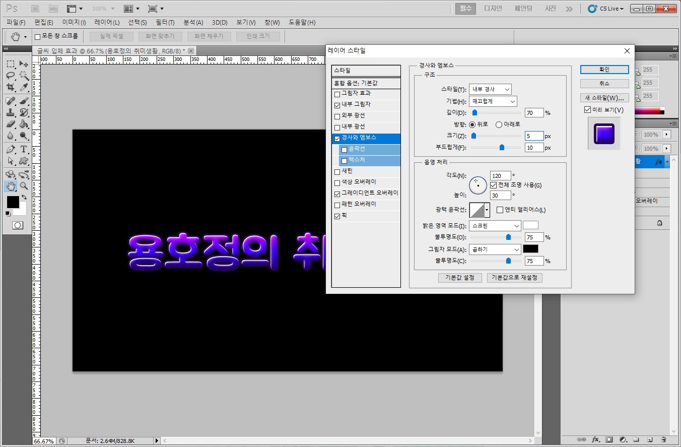 그런데 조금 더 입체감을 주고 싶다면 경사와 엠보스의 값을 조절해줍니다. 딱히 정해진 건 없고 본인이 보면서 조절하셔도 되고, 제가 쓴 옵션이 괜찮다고 생각하시면 값을 똑같이 주셔도 돼요.