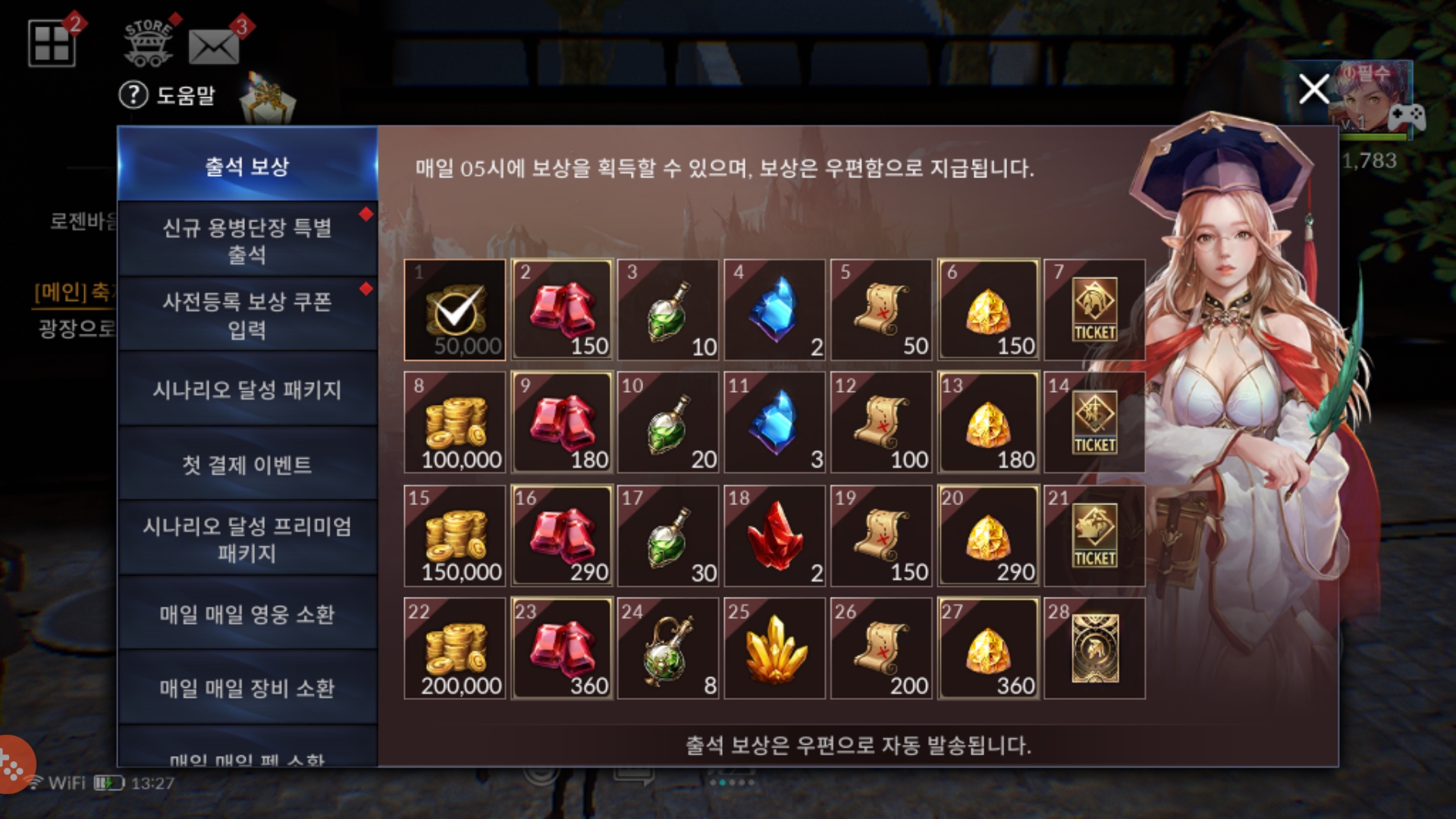 대충 튜토리얼이 끝나면 출석 보상을 보여줍니다. 출석 일일 초기화 시간은 05시에 초기화가 되네요.