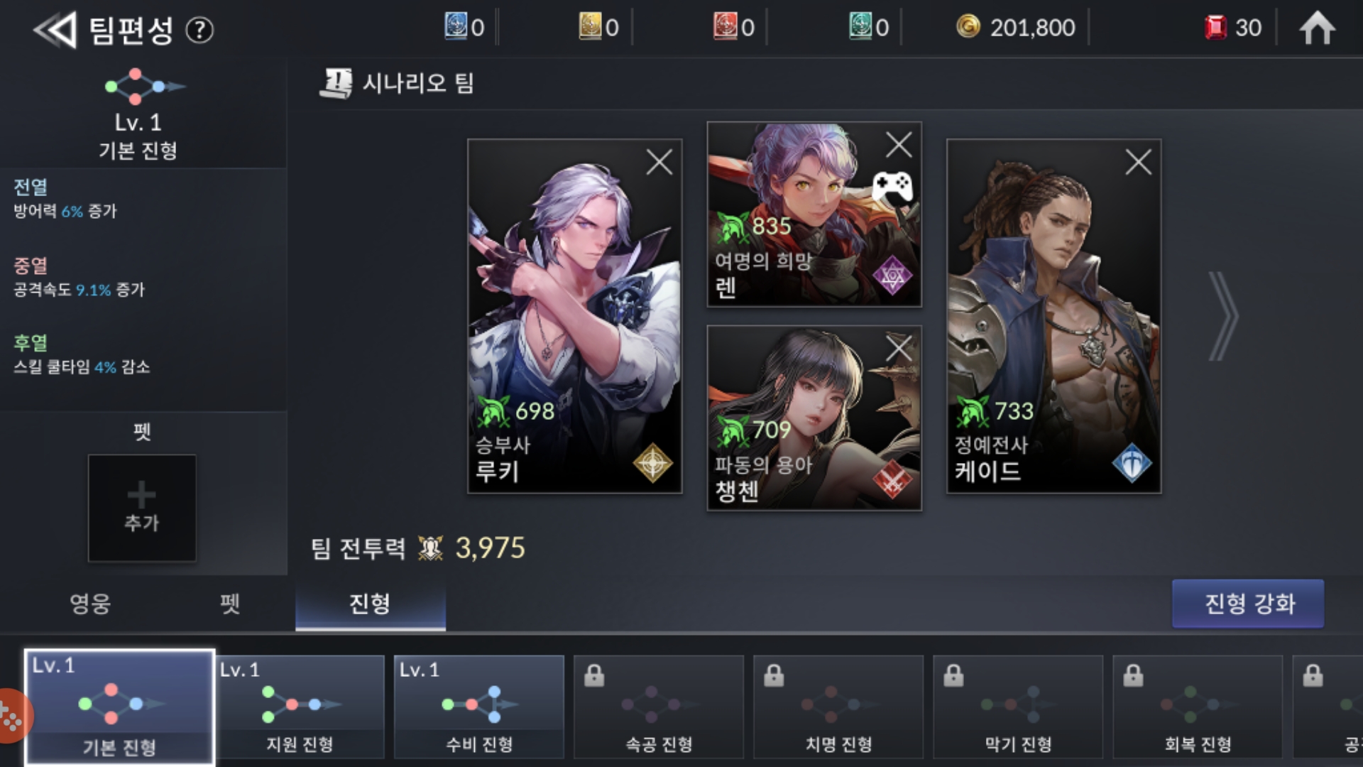 기존 세븐 나이츠에서도 존재했던 진형 시스템이 있습니다. 그런데 사진에서 보이는 수비 진형과 아직 잠겨있는 막기 진형은 포메이션이 같아서 뭐가 다른지는 모르겠네요.