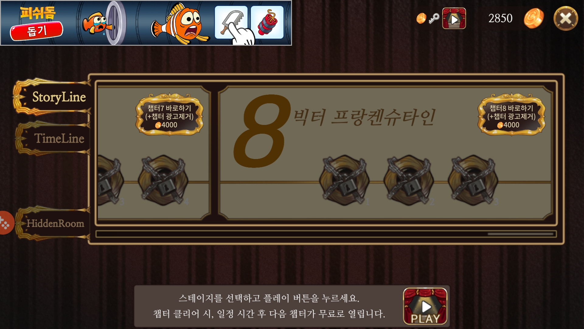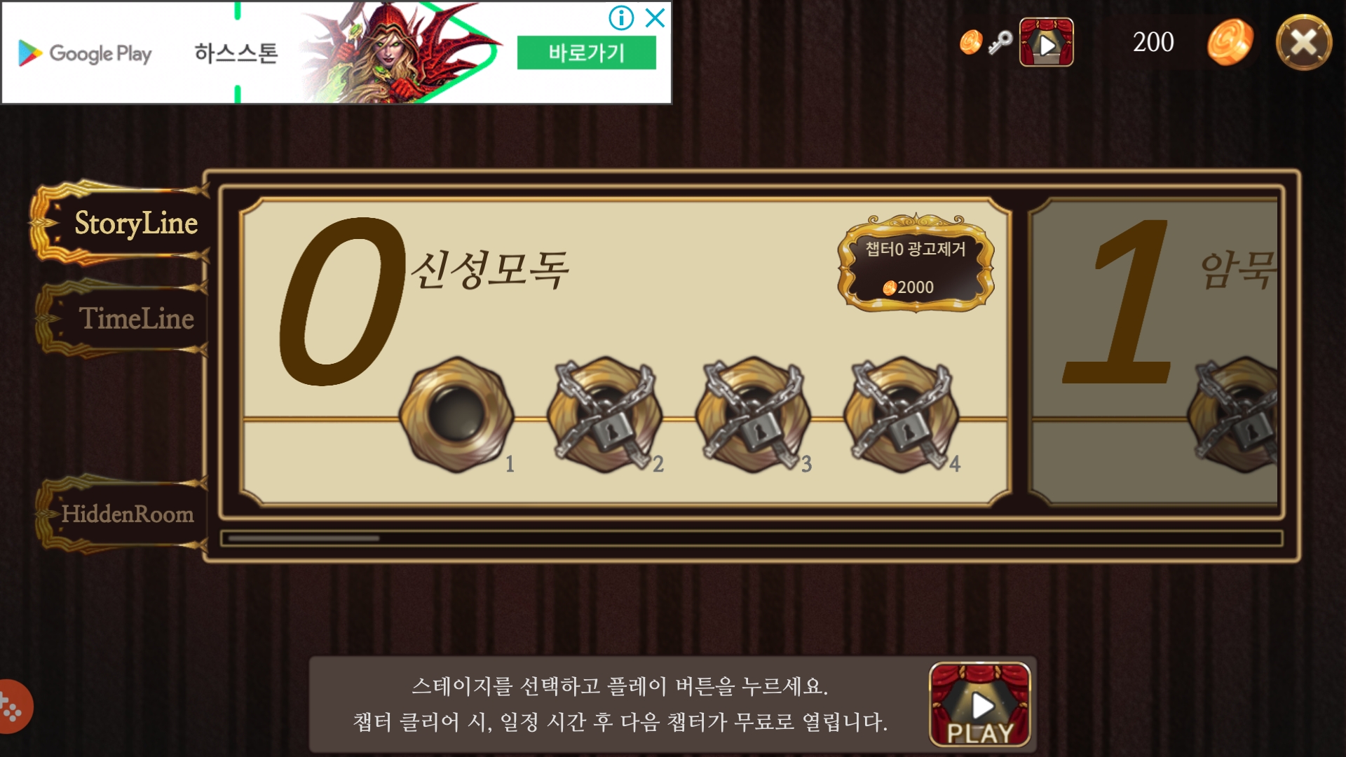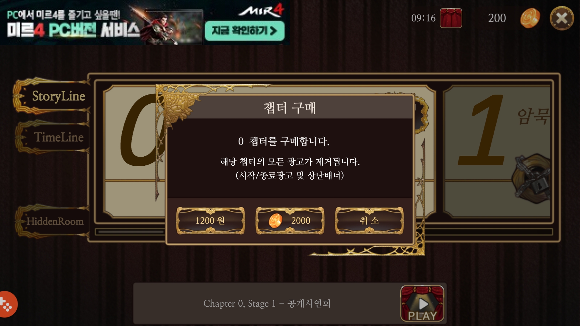 챕터 스테이지마다 시작과 클리어 시 광고가 나오며, 만약 광고 없이 플레이를 원하신다면 금화를 지불하거나 결제를 통하여 광고 없이 플레이 가능합니다. 챕터 0은 1200원이며 1부터는 2,500원의 가격을 지불해야 해요. 물론 광고를 본다면 무료로 플레이 가능합니다.
