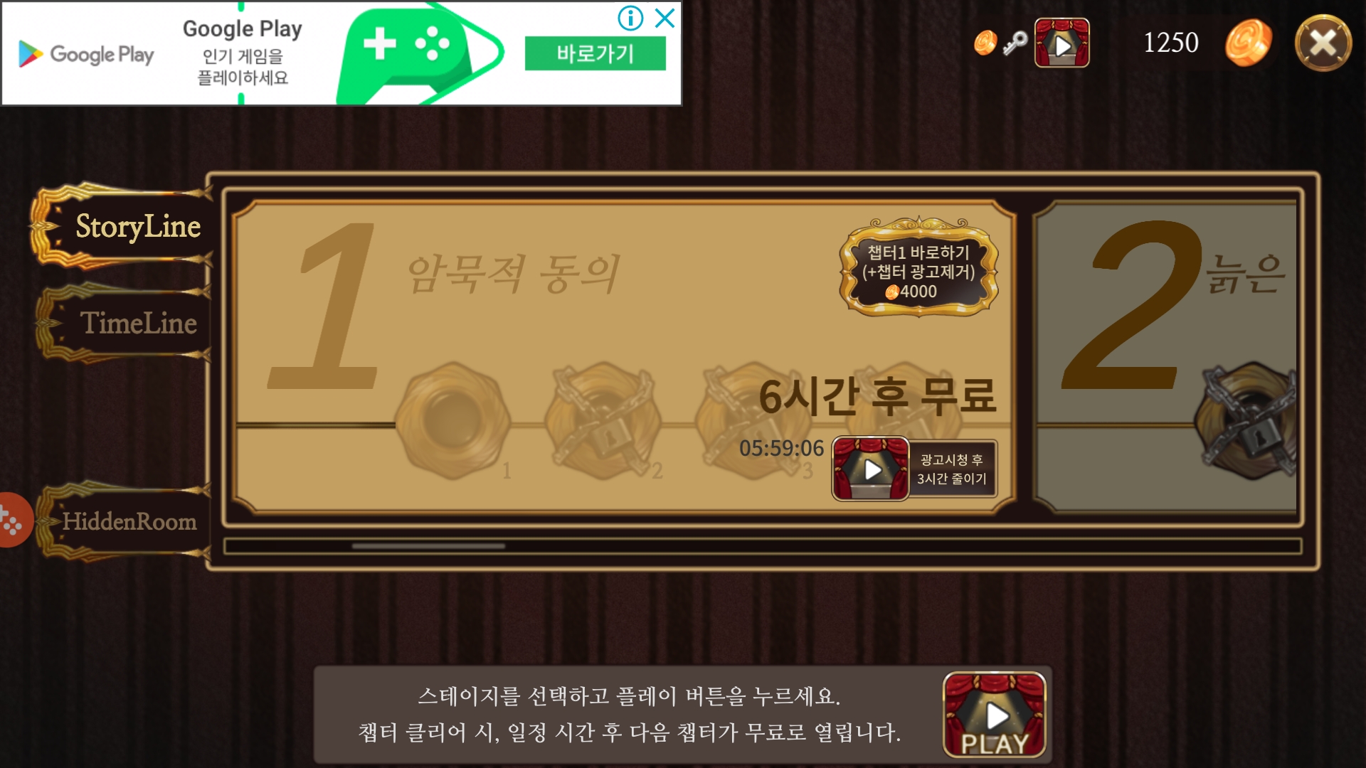 이렇게 챕터를 클리어하게 되면 다음 챕터까지 6시간을 기다려야 무료로 플레이할 수 있습니다. 광고 시청으로 3시간을 줄일 수 있으며, 만약 기다리는 게 힘드신 분은 다음 챕터를 구매하셔서 바로 플레이하실 수도 있습니다.