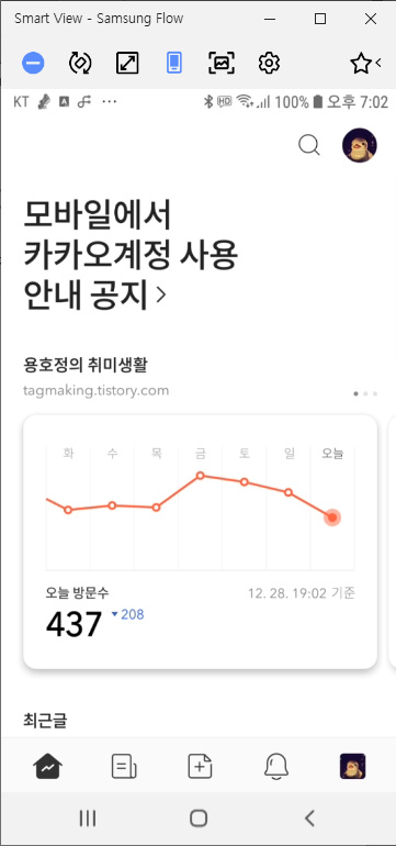 컴퓨터에서 스마트 폰 화면을 띄우고 싶어서 찾아보는데, 대부분 컴퓨터에 무선 랜 카드가 필요하다는 제약이 있어서 안 되나 했는데 윈도우 10과 삼성 휴대폰 사용자라면 '삼성 플로우'를 통해 할 수 있다고 하여 직접 해보니 괜찮은 것 같아서 사용 방법을 올립니다.