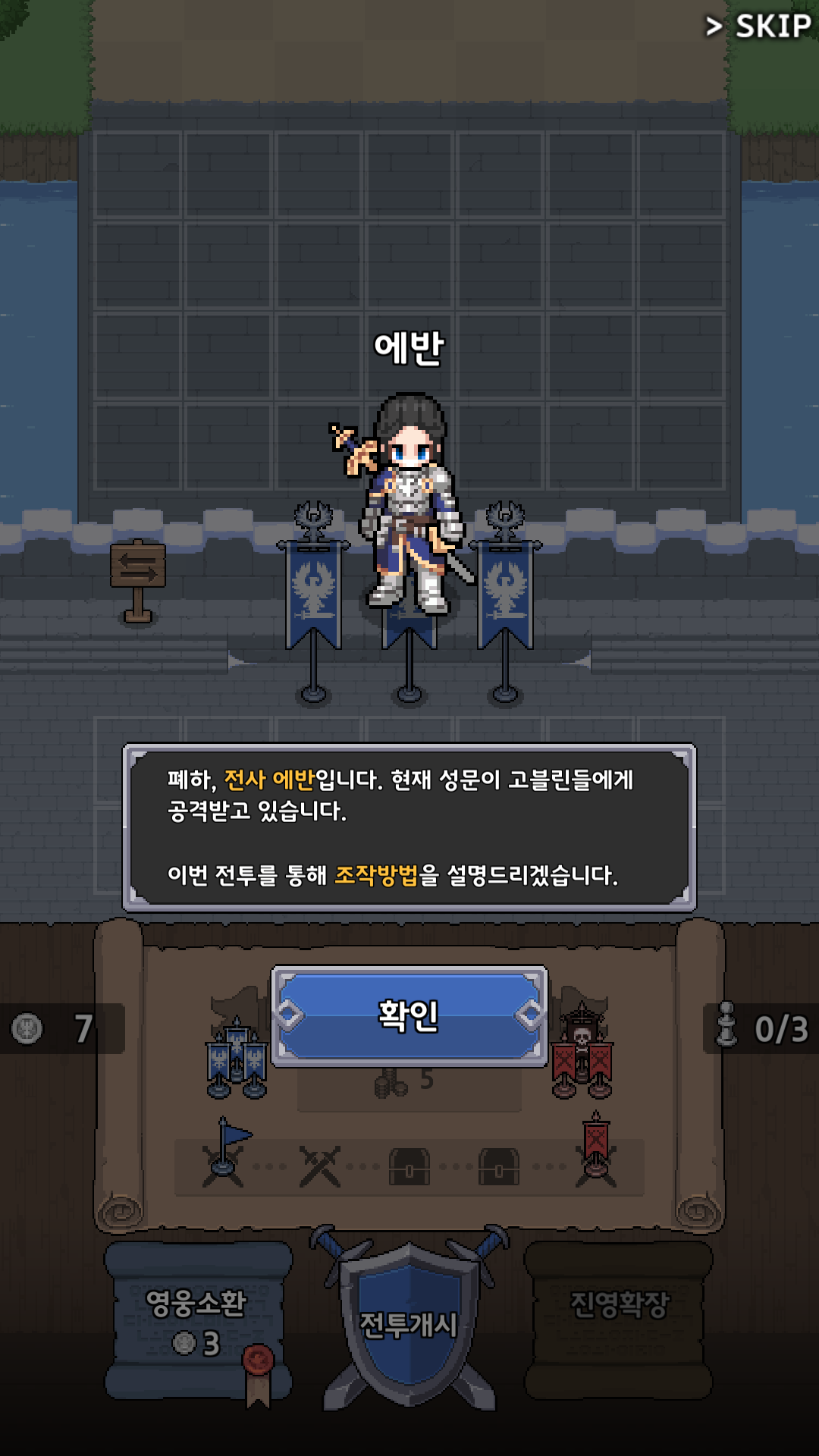 처음에는 역시 튜토리얼을 진행합니다. 우선 은화로는 영웅 소환을 하거나, 진영 확장을 합니다. 또 가끔씩 등장하는 상점에서 아이템을 구매할 수도 있어요. 그리고 중복 영웅의 경우 더블 터치로 합성하여 등급을 올릴 수 있습니다.