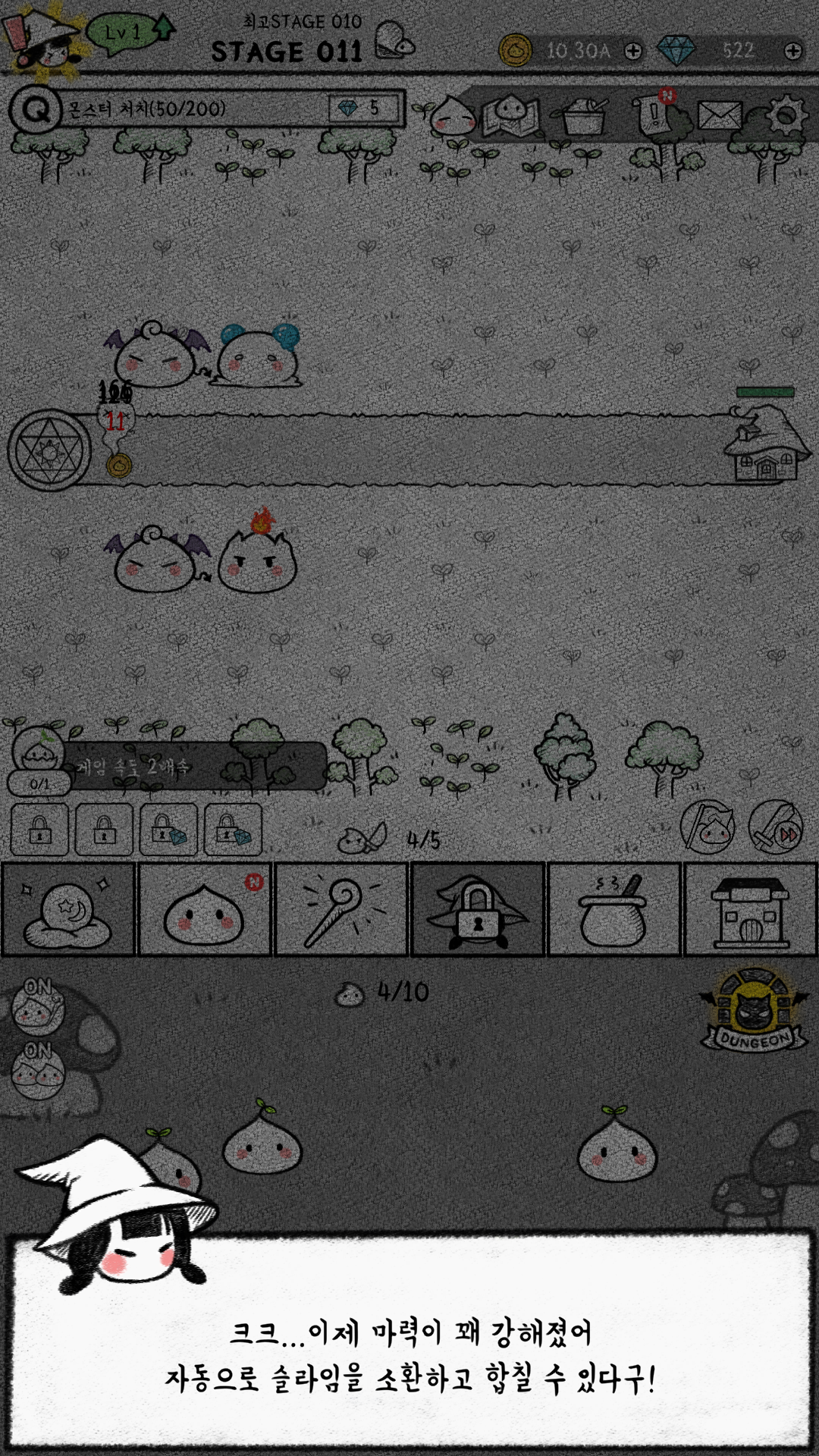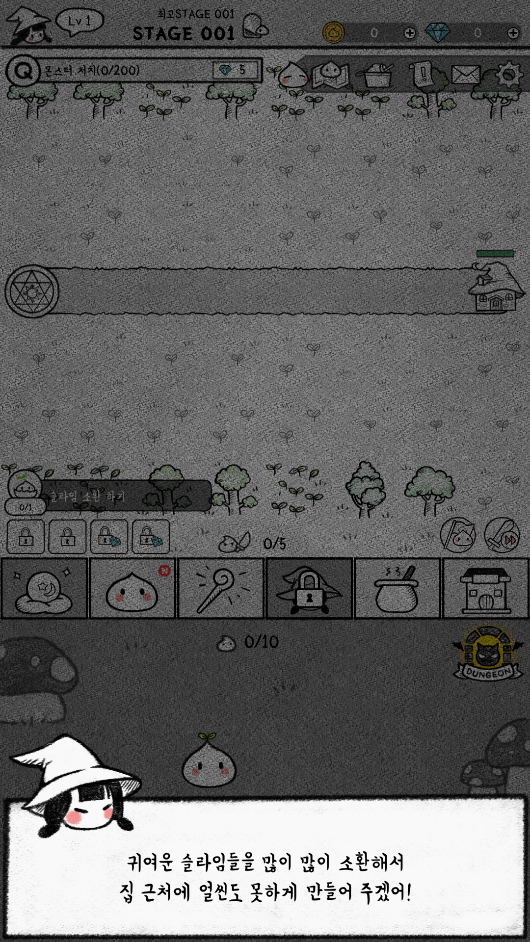 짧은 스토리를 다 보고 나면 본격적으로 마녀가 등장하고, 슬라임을 소환해서 집을 지키라고 합니다.