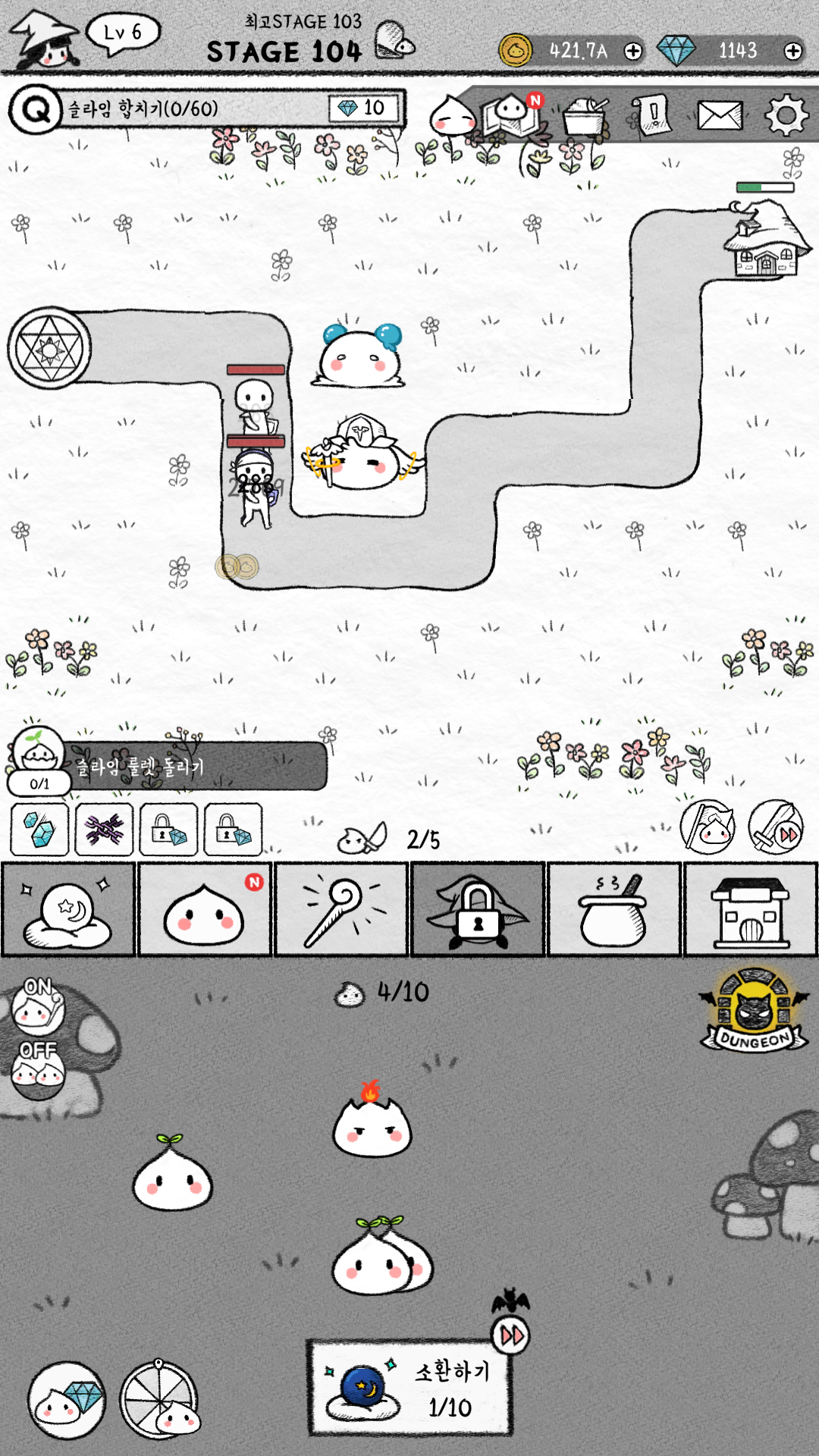 결국 마지막 슬라임을 뽑아봤는데, 업그레이드가 안되면 업그레이드를 진행한 몇 단계 아래 슬라임보다 못하네요. 그리고 공격 속도는 빠른데, 근접이라 반경이 좁아서 바로 이전 단계 슬라임보다 별로였어요.