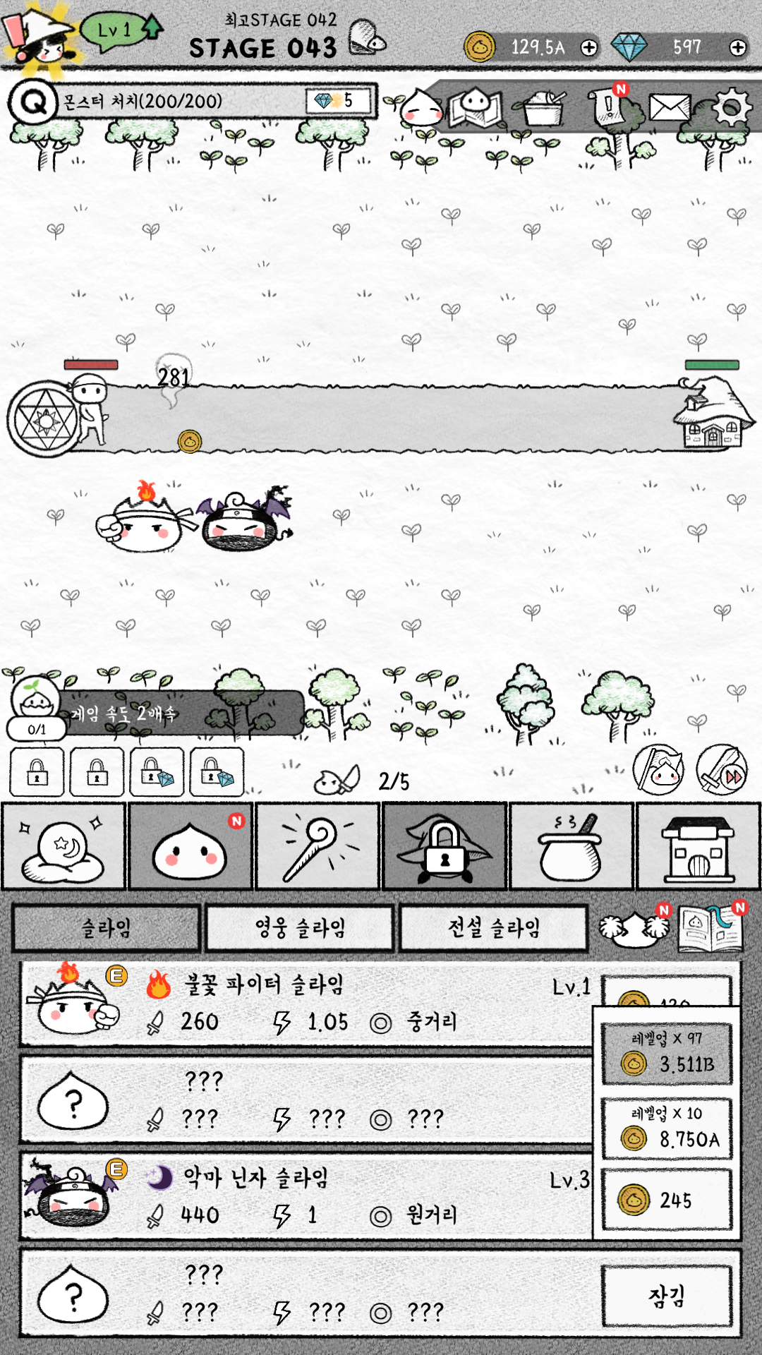 슬라임은 기본 슬라임, 영웅 슬라임, 전설 슬라임 이렇게 있는데, 이미 게임은 재미가 없다고 판단을 내렸지만 기본 슬라임의 가장 아래 슬라임이 궁금해서 거기까지만 진행해보기로 했습니다.