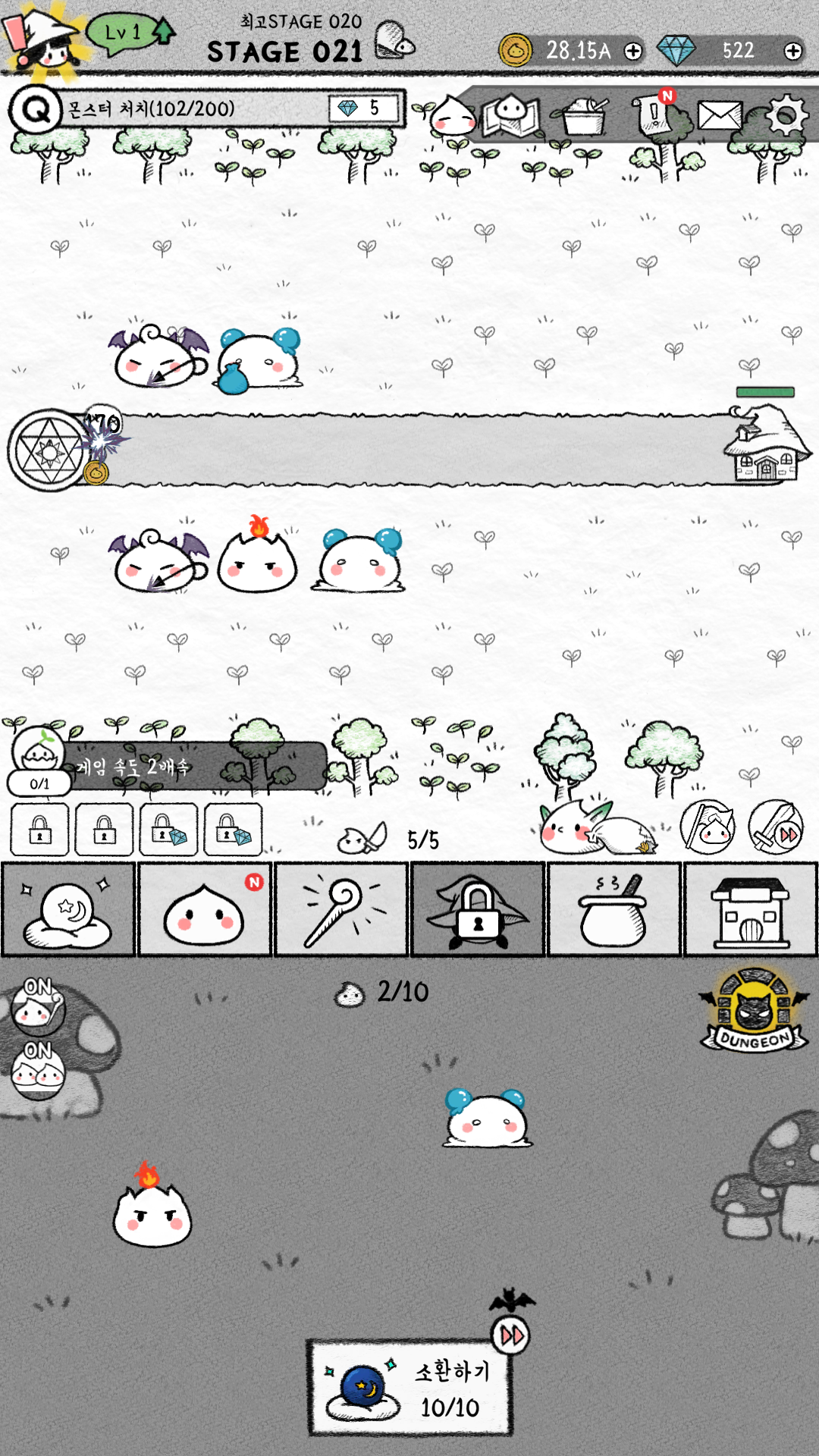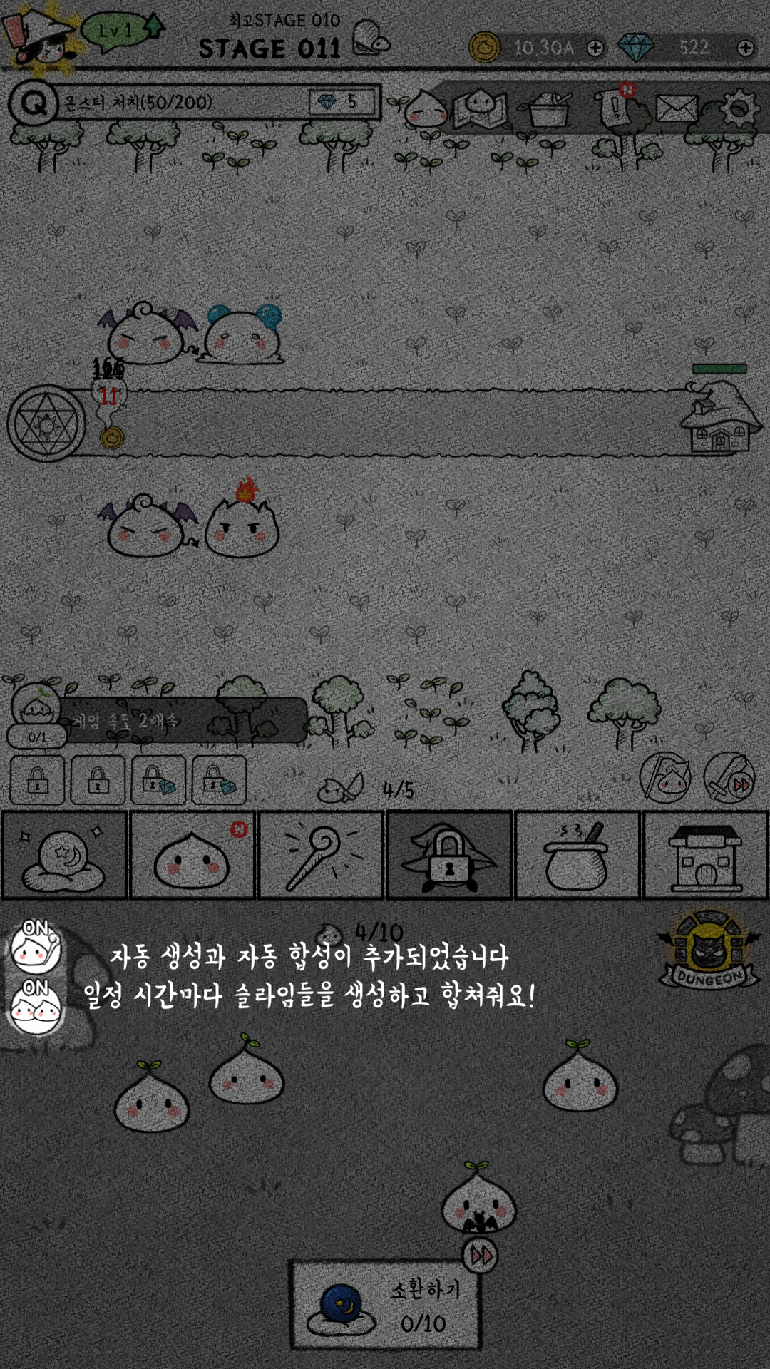 자동 소환과 자동 합성을 켜놓고 지켜봤는데 소환 가능한 슬라임이 가득 찼으나, 쿨이 되지 않아서 소환이 되지 않고 있습니다. 소환도 한 번에 다 해주는 게 아니라 딱 하나 해주고, 합성도 딱 하나 해줍니다. 결국 다이아로 업그레이드를 많이 해주거나 그게 아니라면 상당한 부분을 손으로 해야 돼요.